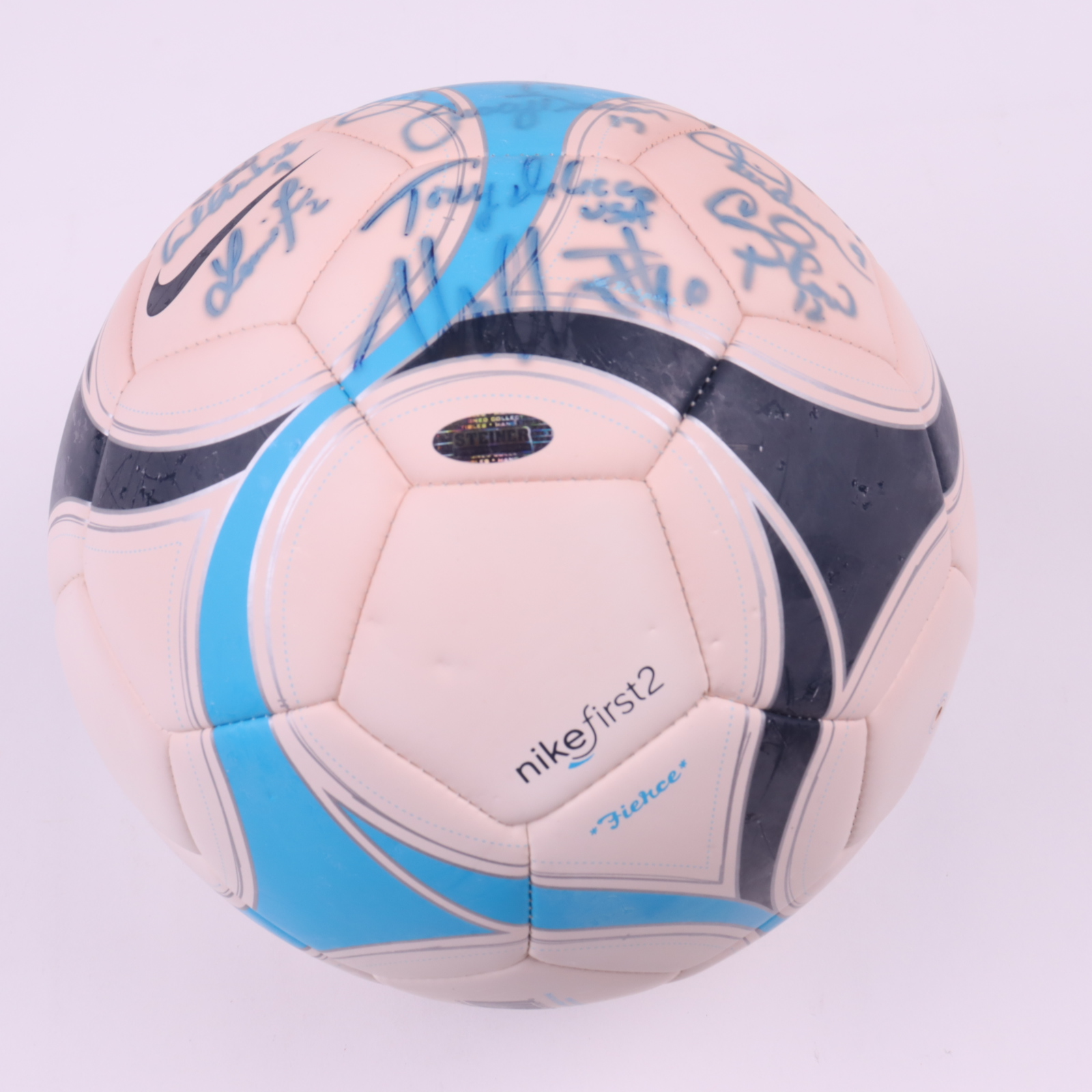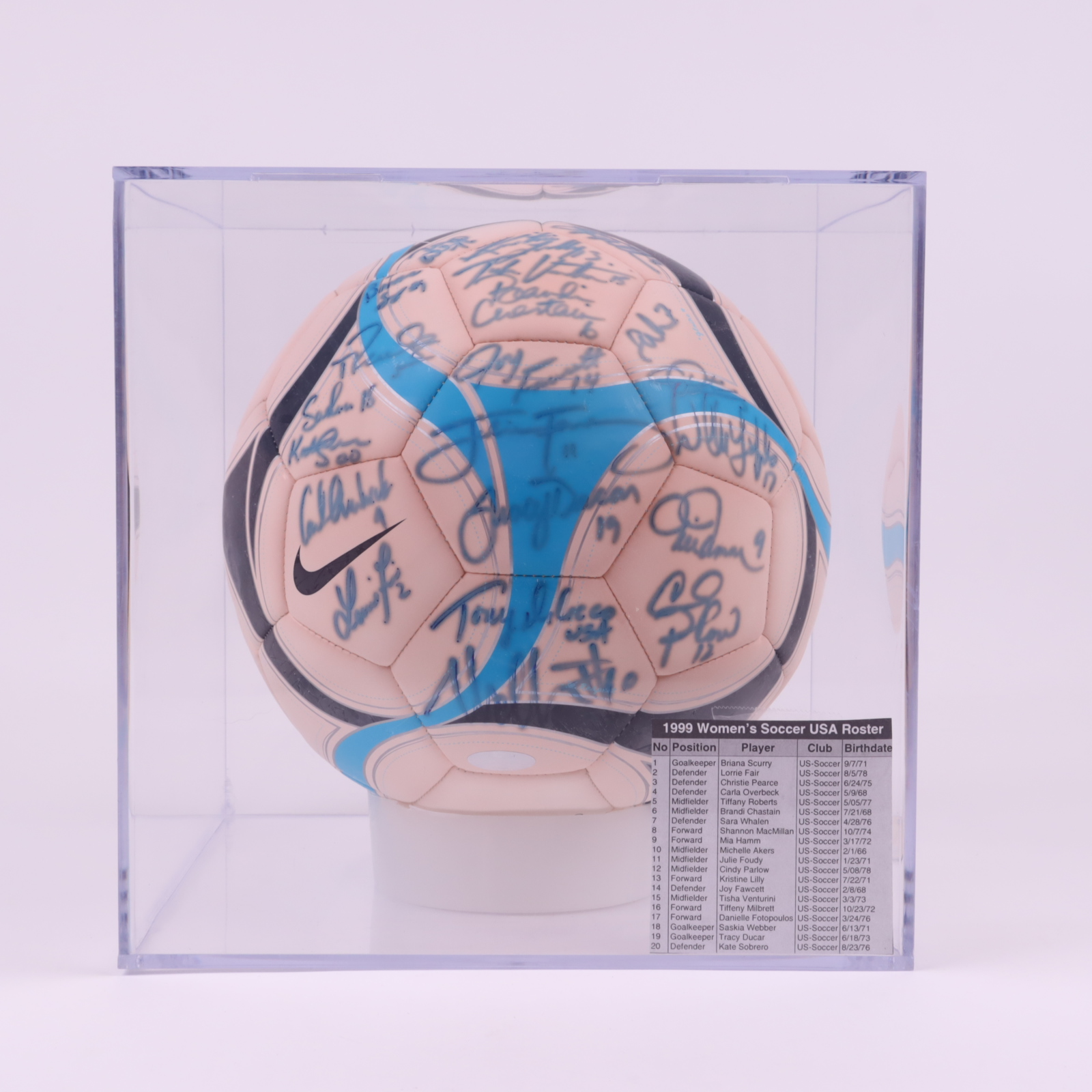 Nike soccer ball has been hand-signed by (20) including Mia Hamm, Julie Foudy, Brandi Chastain, Michelle Akers, Kate Sobrero, Sara Whalen, Cindy Parlow, Shannon MacMillan, Tisha Venturini and (11) others. Please note, the display case is included as shown.