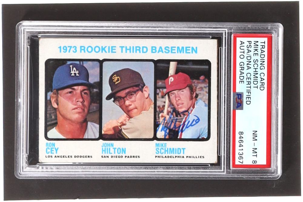 Mike Schmidt Signed 1973 Topps #615 Rookie Third Basemen / Ron Cey / John Hilton RC (PSA)
