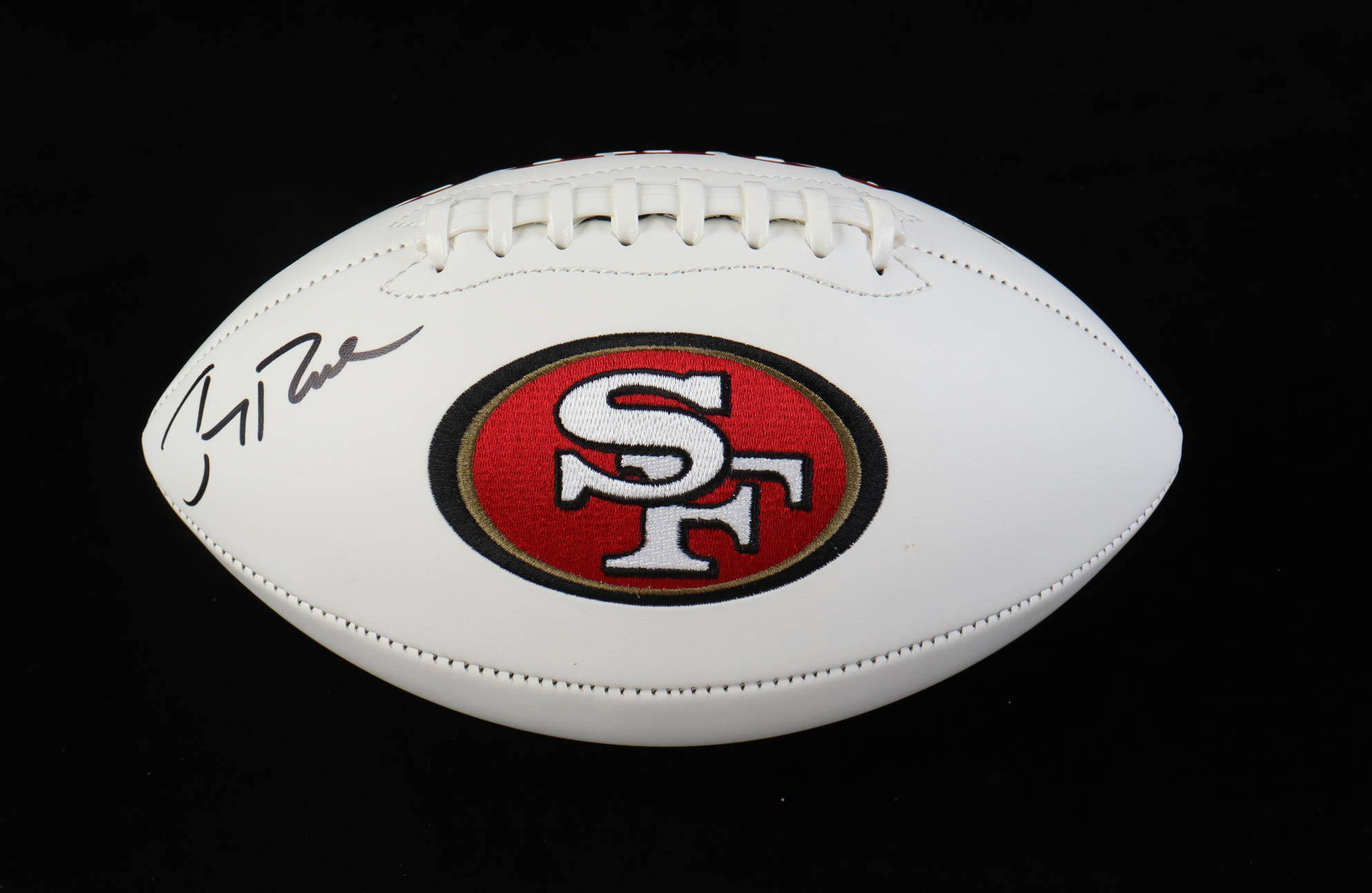 San Francisco 49ers logo football has been hand-signed by Jerry Rice (HOF).