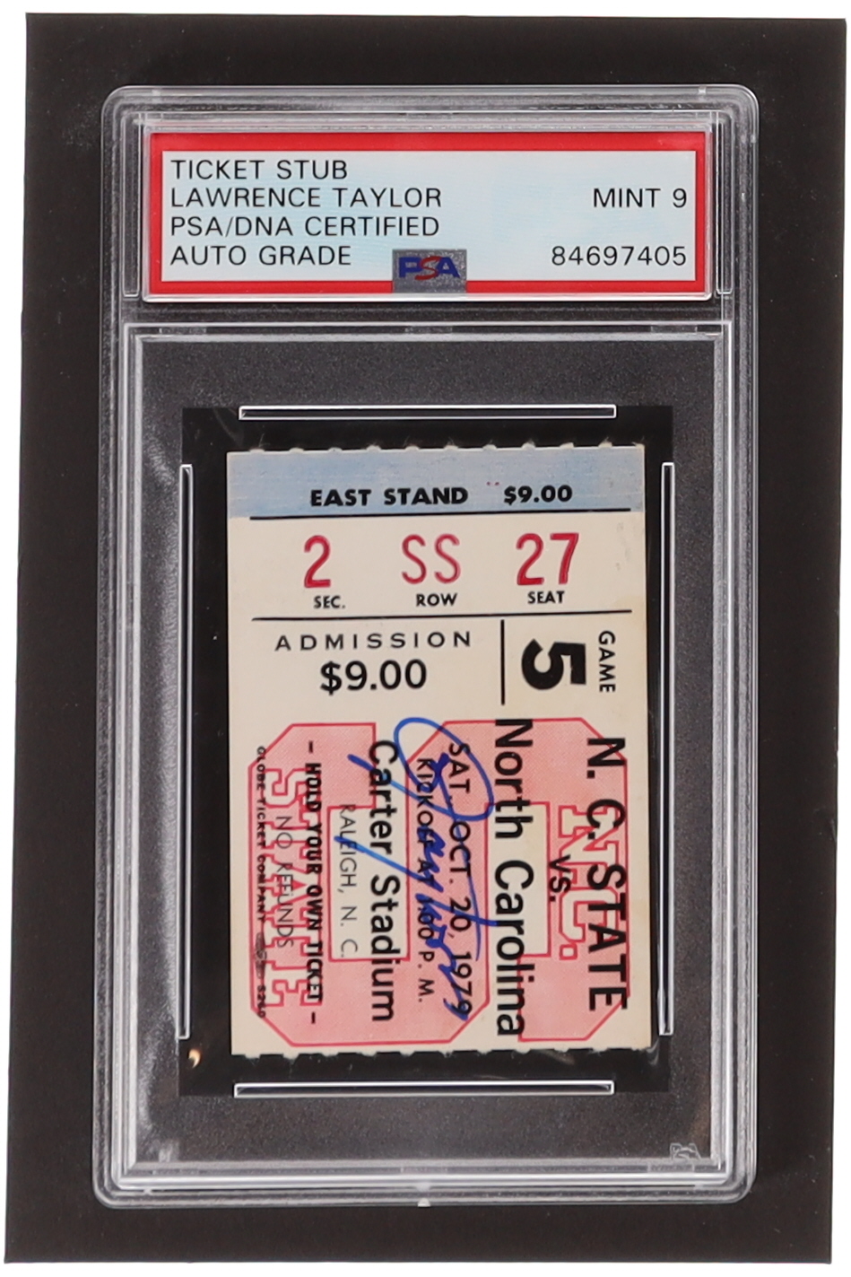Ticket dated Otober 20, 1979 has been hand-signed by Lawrence Taylor (North Carolina Tar Heels, HOF).