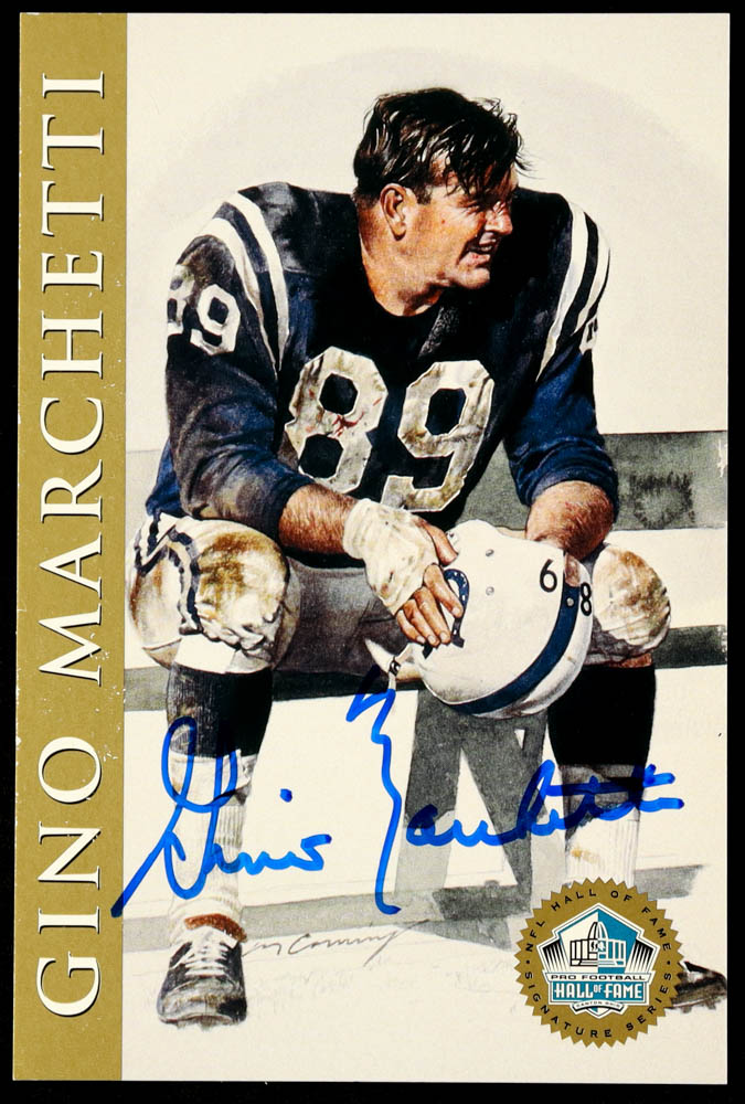 Hall of Fame Signature Series Card measures approximately 4" x 6" in size and has been hand-signed and inscribed by Gino Marchetti (D. 2019, Baltimore Colts, HOF).