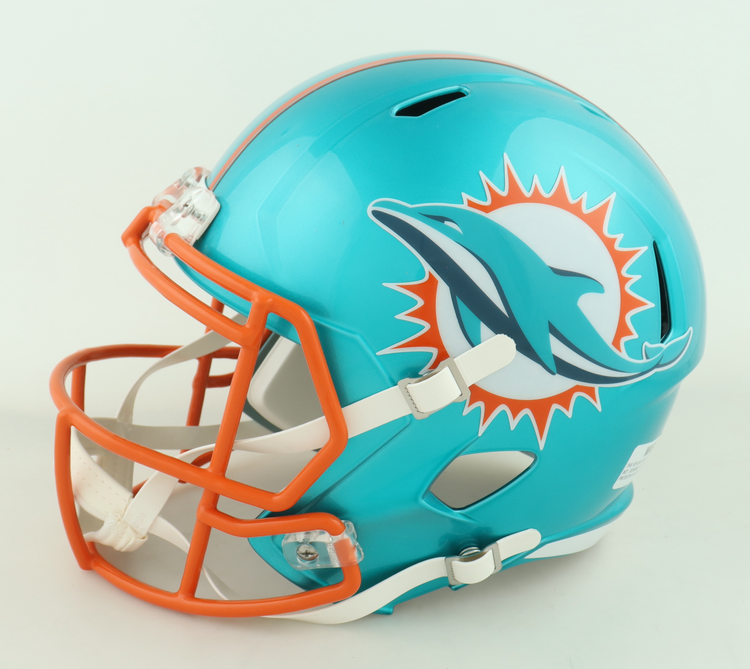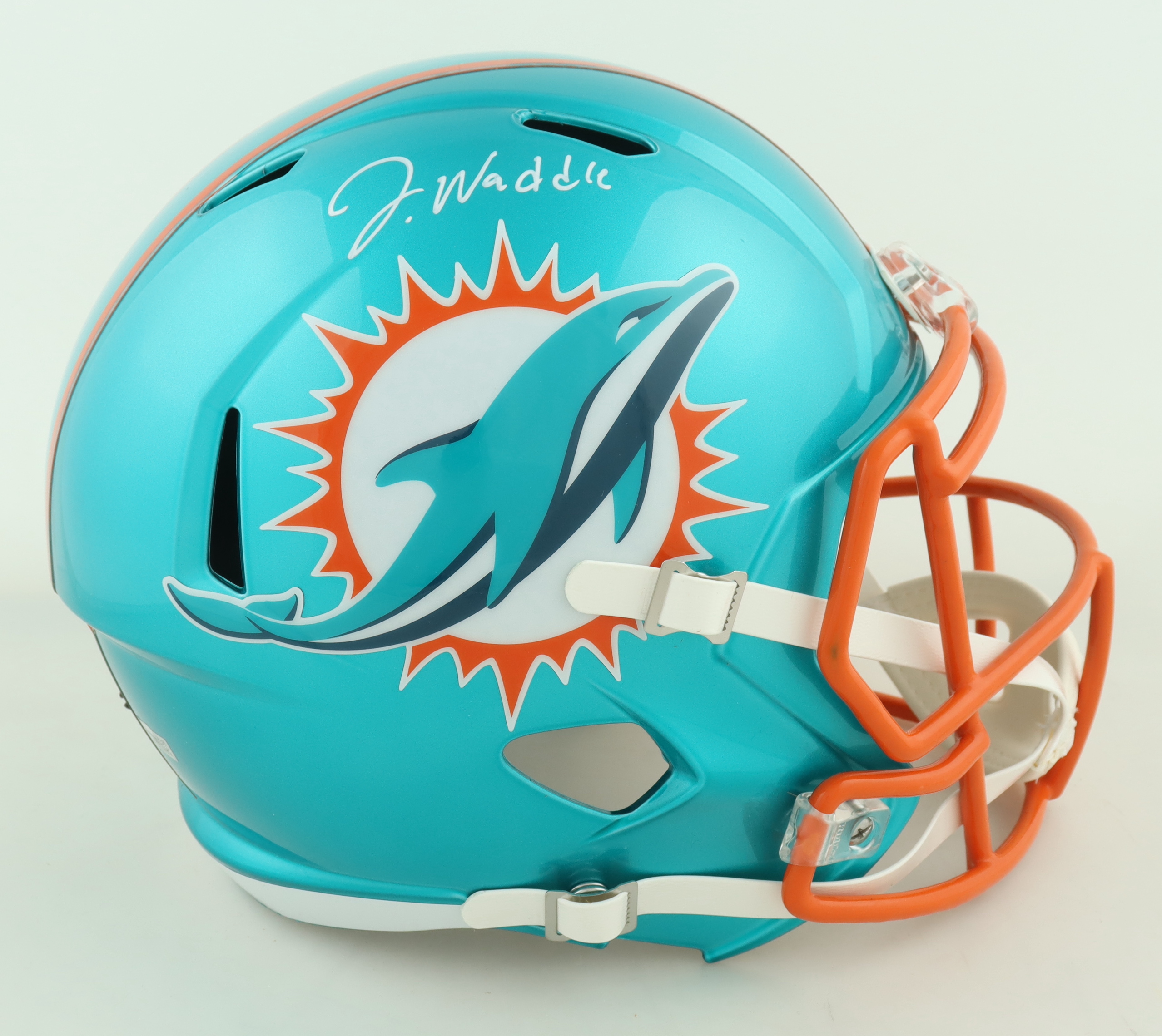 Riddell Miami Dolphins full-size replica Flash Alternate speed helmet has been hand-signed by Jaylen Waddle.