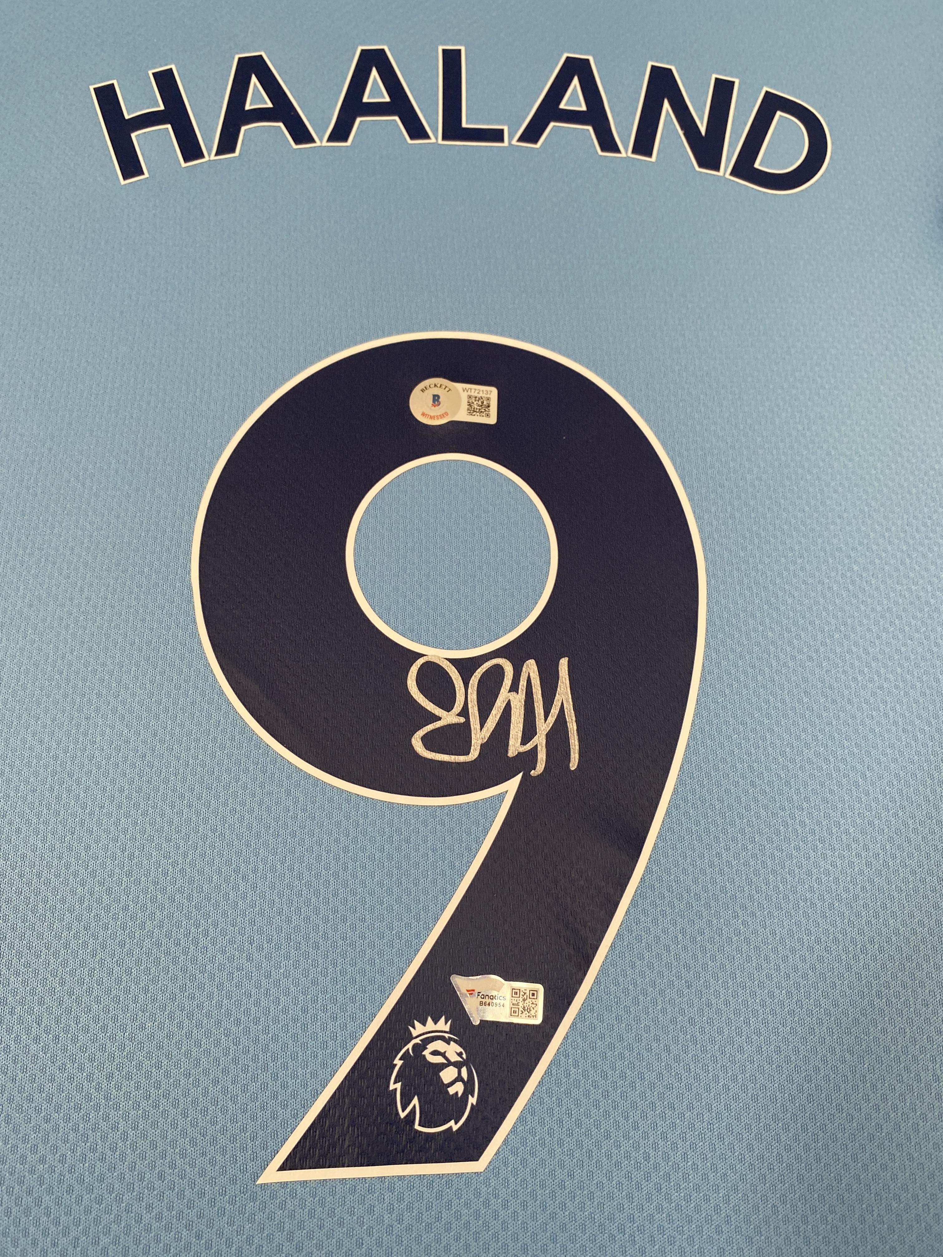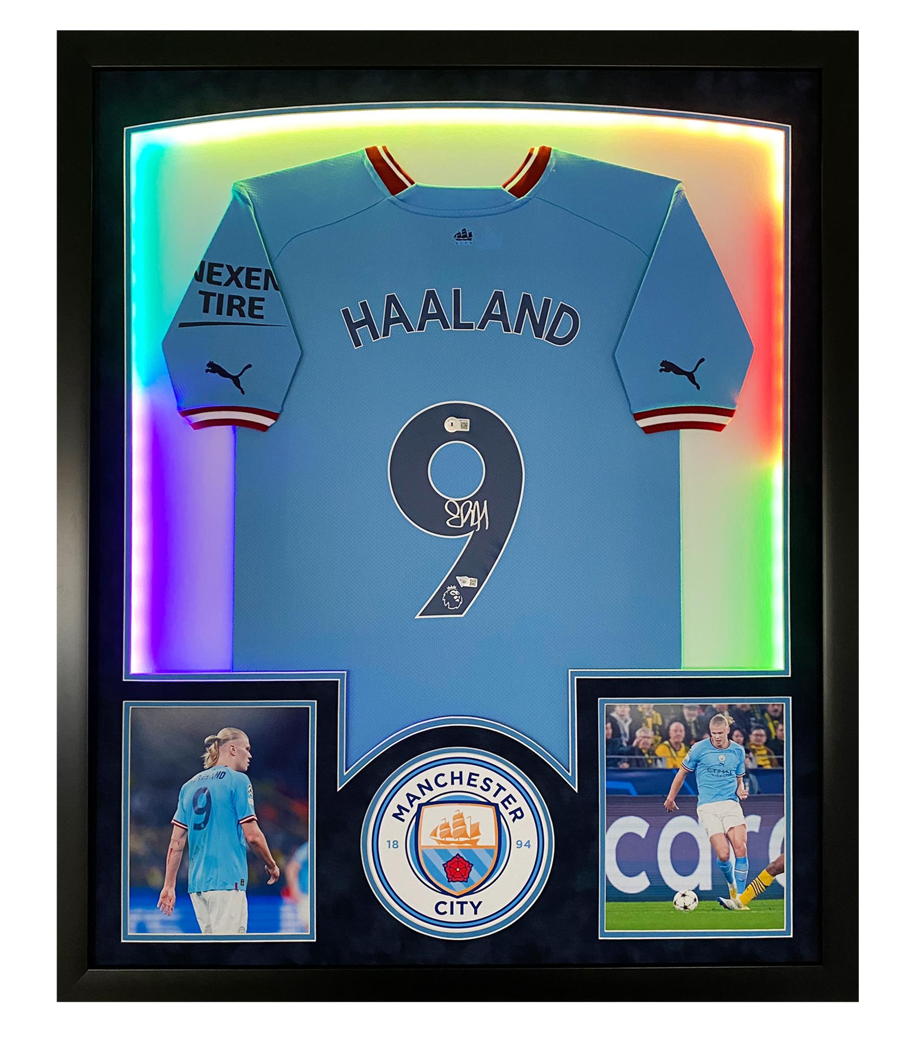 Custom frame measures 30" x 40" in size and features a Puma on-field style jersey that has been hand-signed by Erling Haaland (Manchester City). The frame includes embedded USB-powered LED lights.