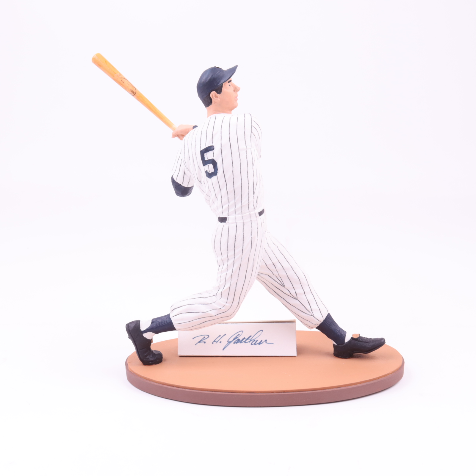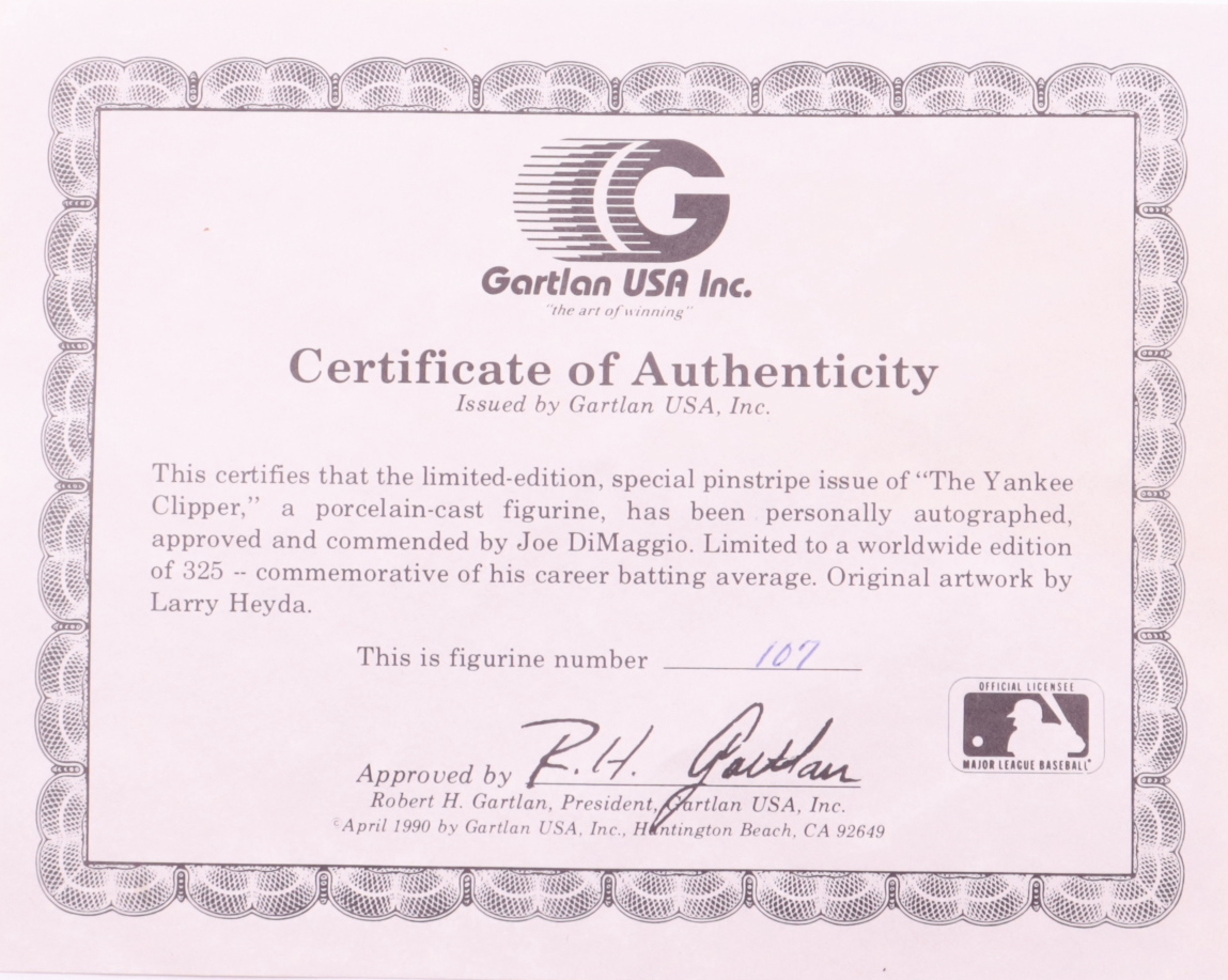 Gartlan ceramic figure measures approximately 8" in height. Features a cut that has been hand-signed by Joe DiMaggio (D.1999, New York Yankees, HOF). Limited edition #107/325. Please see photos regarding the condition.