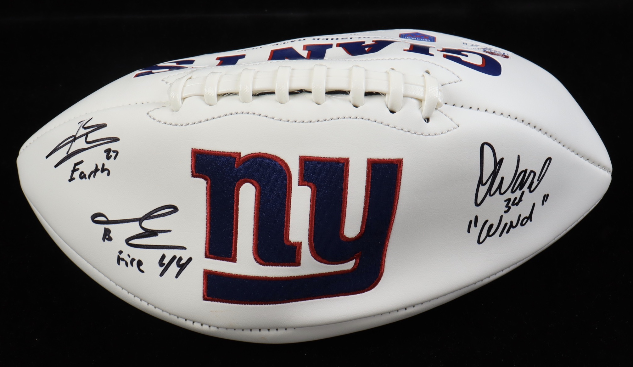 Brandon Jacobs, Derrick Ward & Ahmad Bradshaw Signed Giants Logo Football Inscribed "Earth", "Wind" & "Fire" (Beckett)