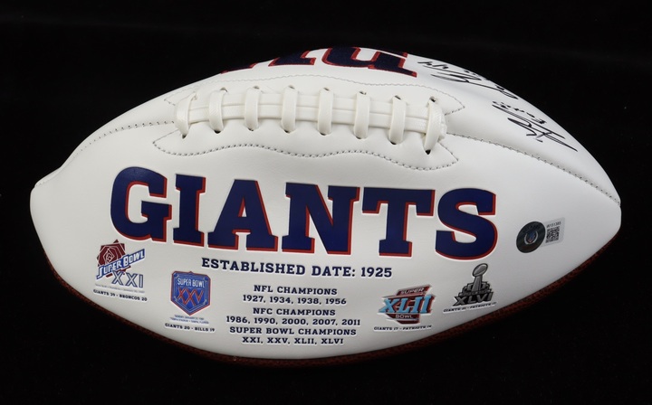 New York Giants logo football. Hand-signed and inscribed by Brandon Jacobs, Derrick Ward and Ahmad Bradshaw.