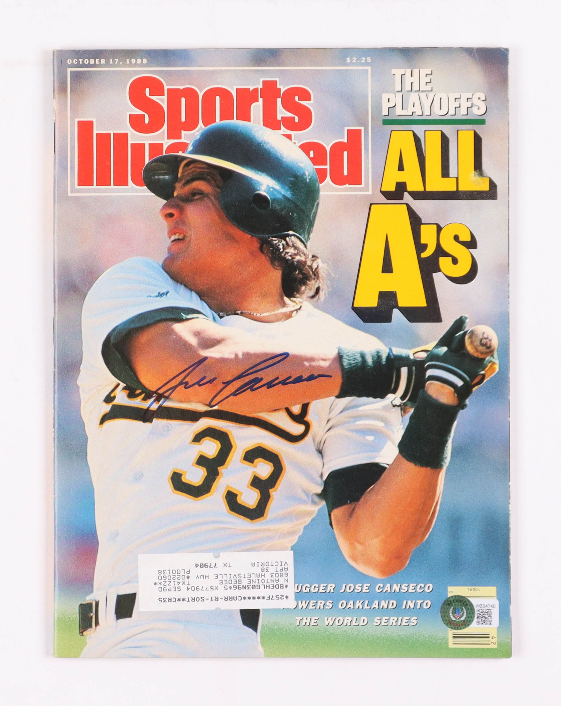 October 17th, 1988 issue of Sports Illustrated magazine has been hand-signed by Jose Canseco (Oakland Athletics).