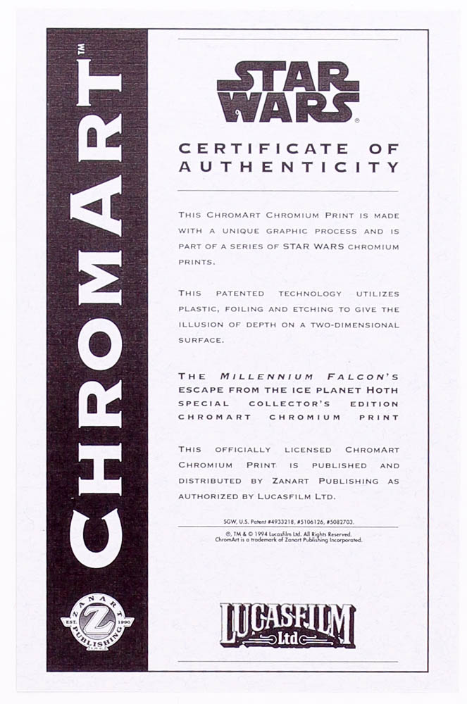 Star Wars The Empire Strikes Back 1994 Limited Edition Chromium Print: Millennium Falcon's Escape (Lucasfilm COA)