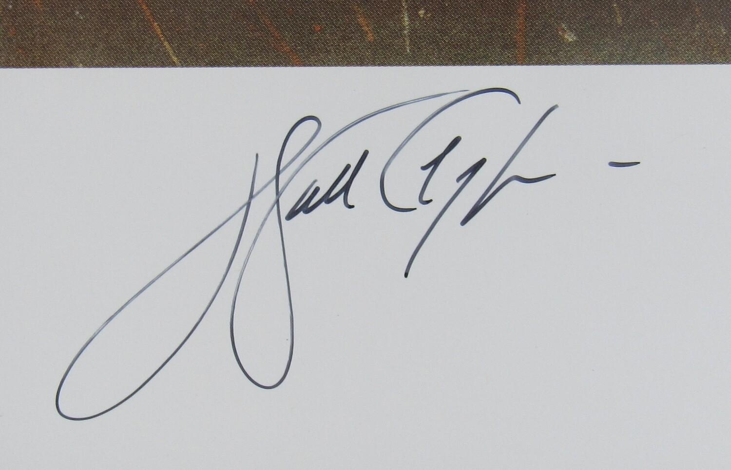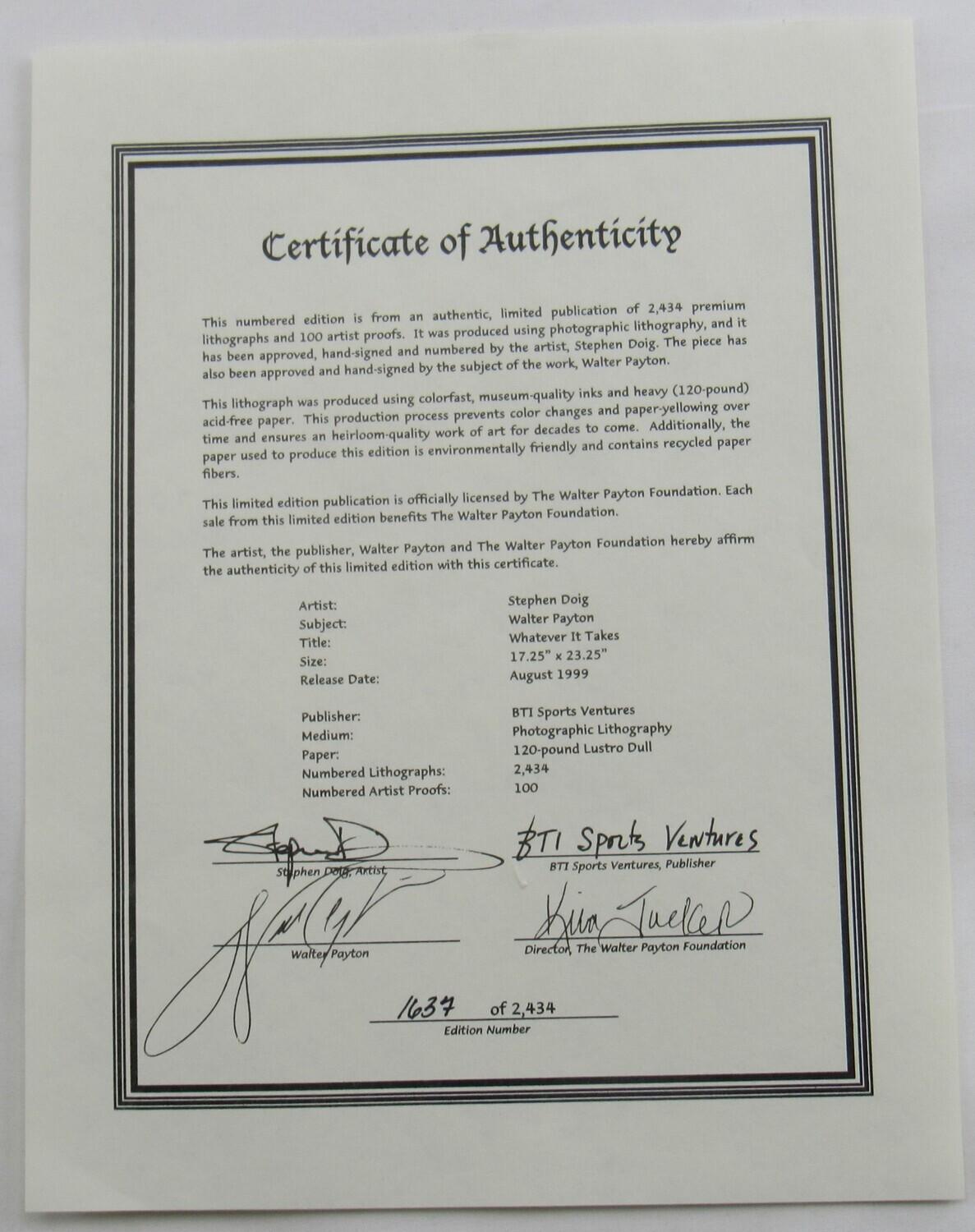 Matted Lithograph measures 22" x 28" in size and features a print that has been hand-signed by Walter Payton (Chicago Bears, HOF) and the artist Stephen Doig. Print is limited edition #1637/2434