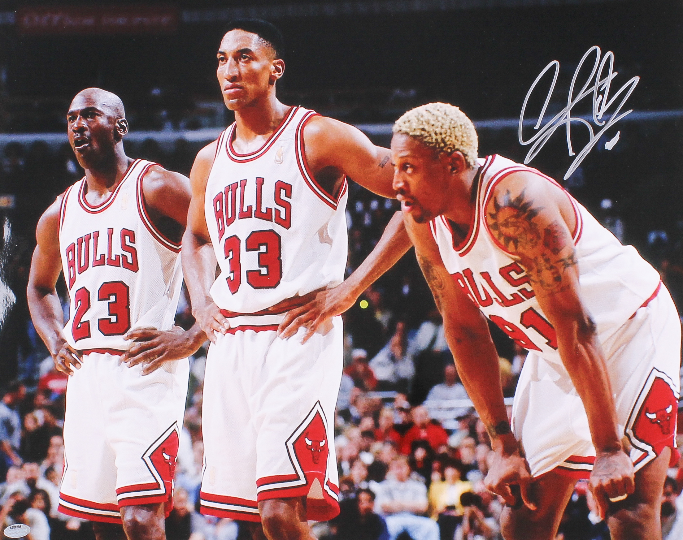 Dennis Rodman Signed Bulls 16x20 Photo with Michael Jordan & Scottie Pippen (Schwartz COA)