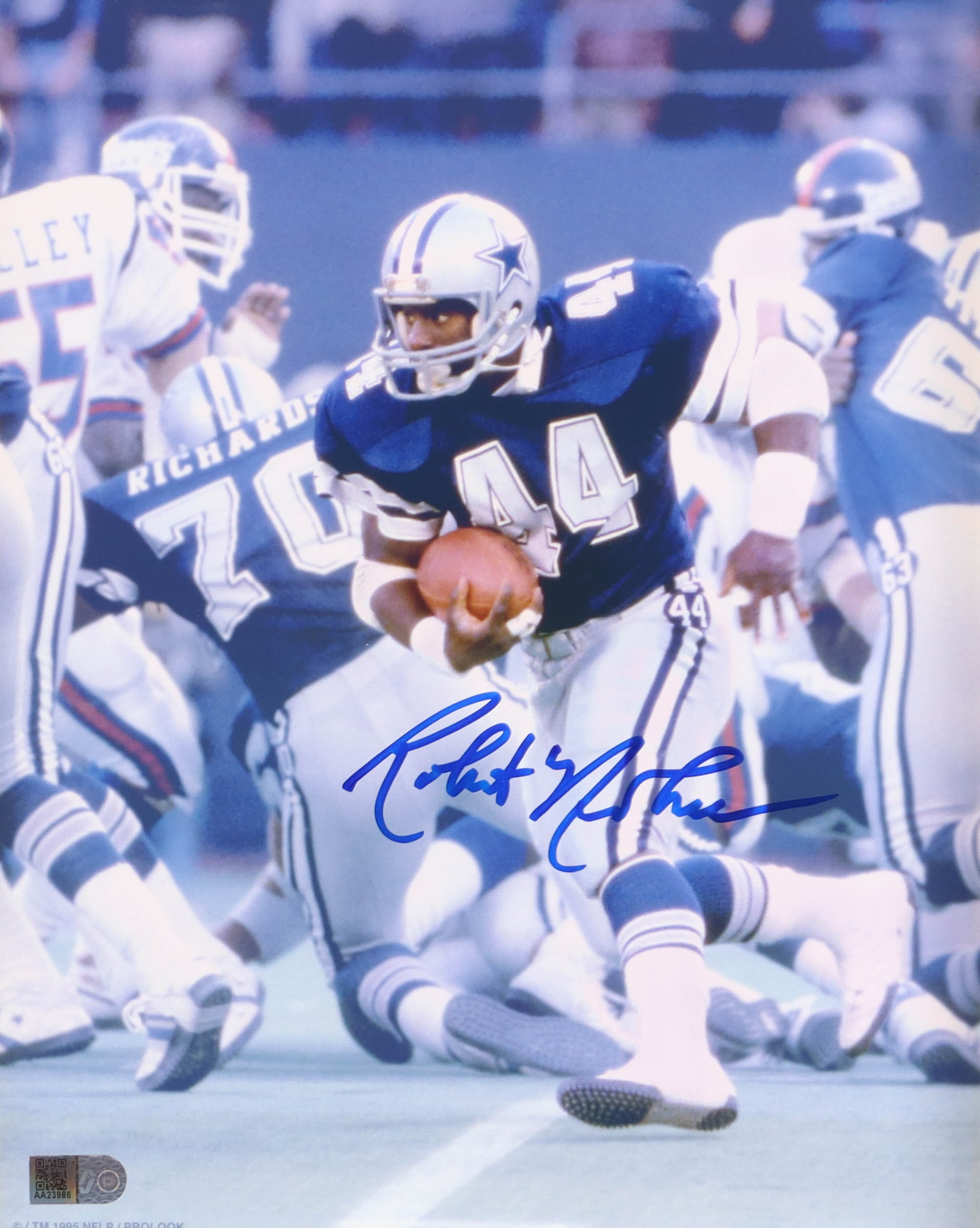 Photo measures 8" x 10" in size and has been hand-signed by Robert Newhouse (D. 2014, Dallas Cowboys).