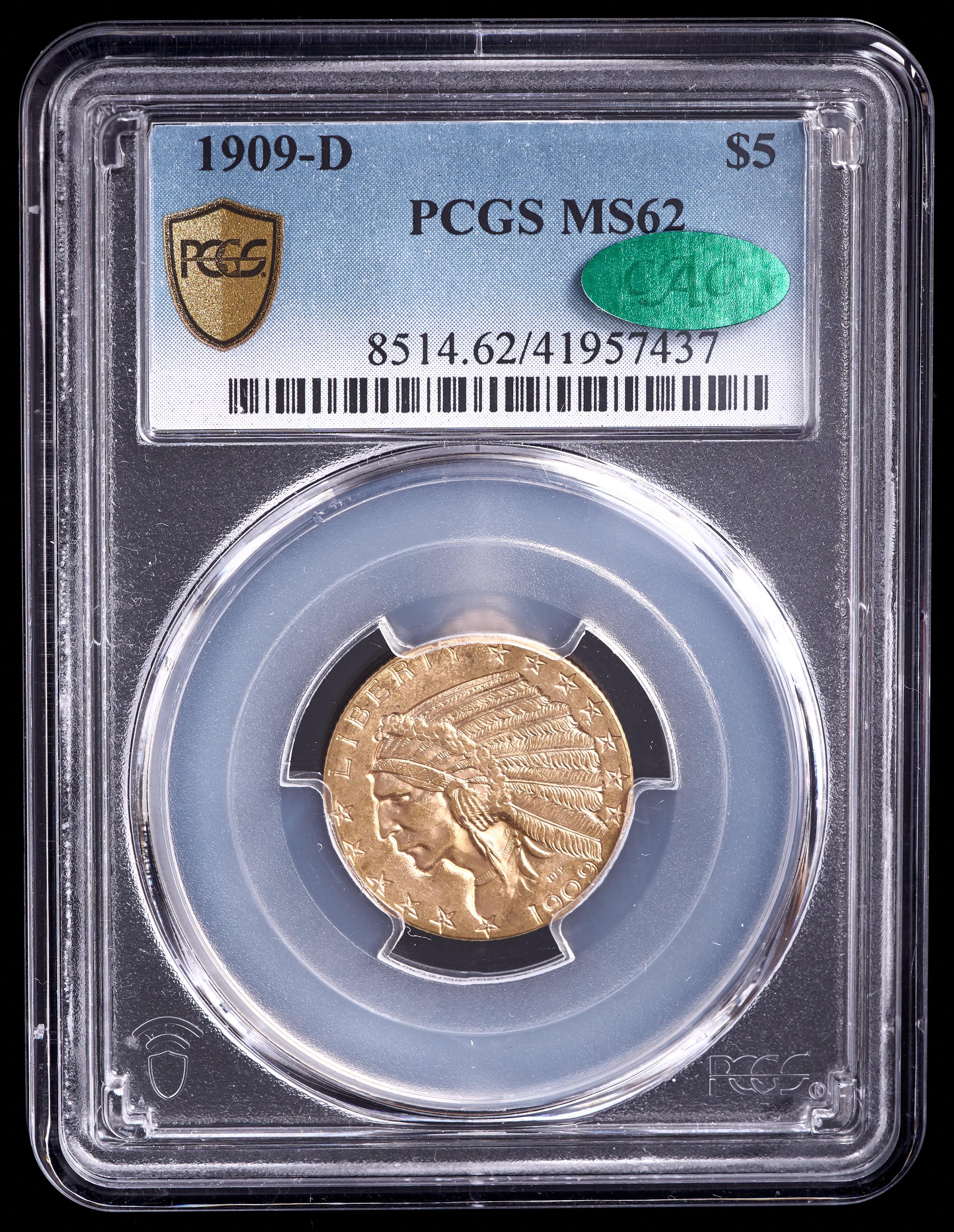1909-D $5 Five-Dollar Indian Head Half Eagle Gold Coin (PCGS MS62 CAC)