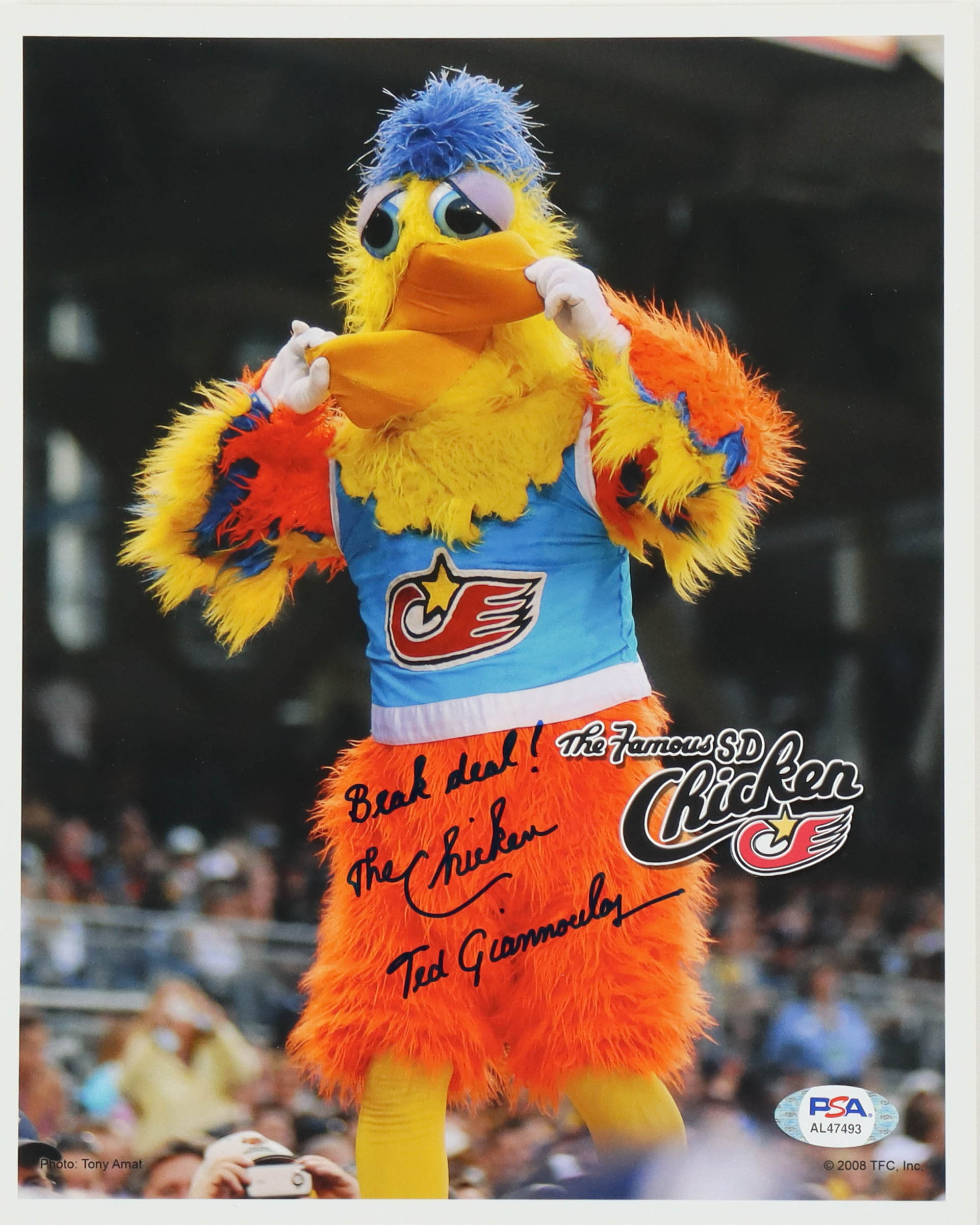 Ted Giannoulas Signed 8x10 Photo Inscribed "Beak Deal!" & "The Chicken" (PSA)