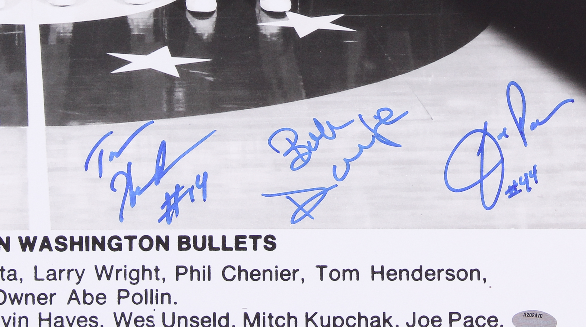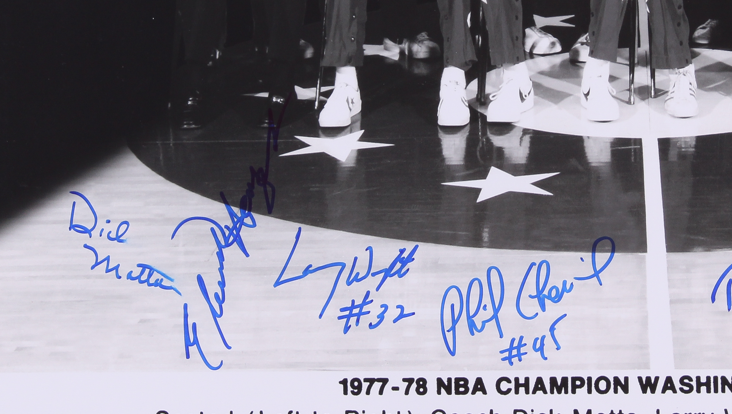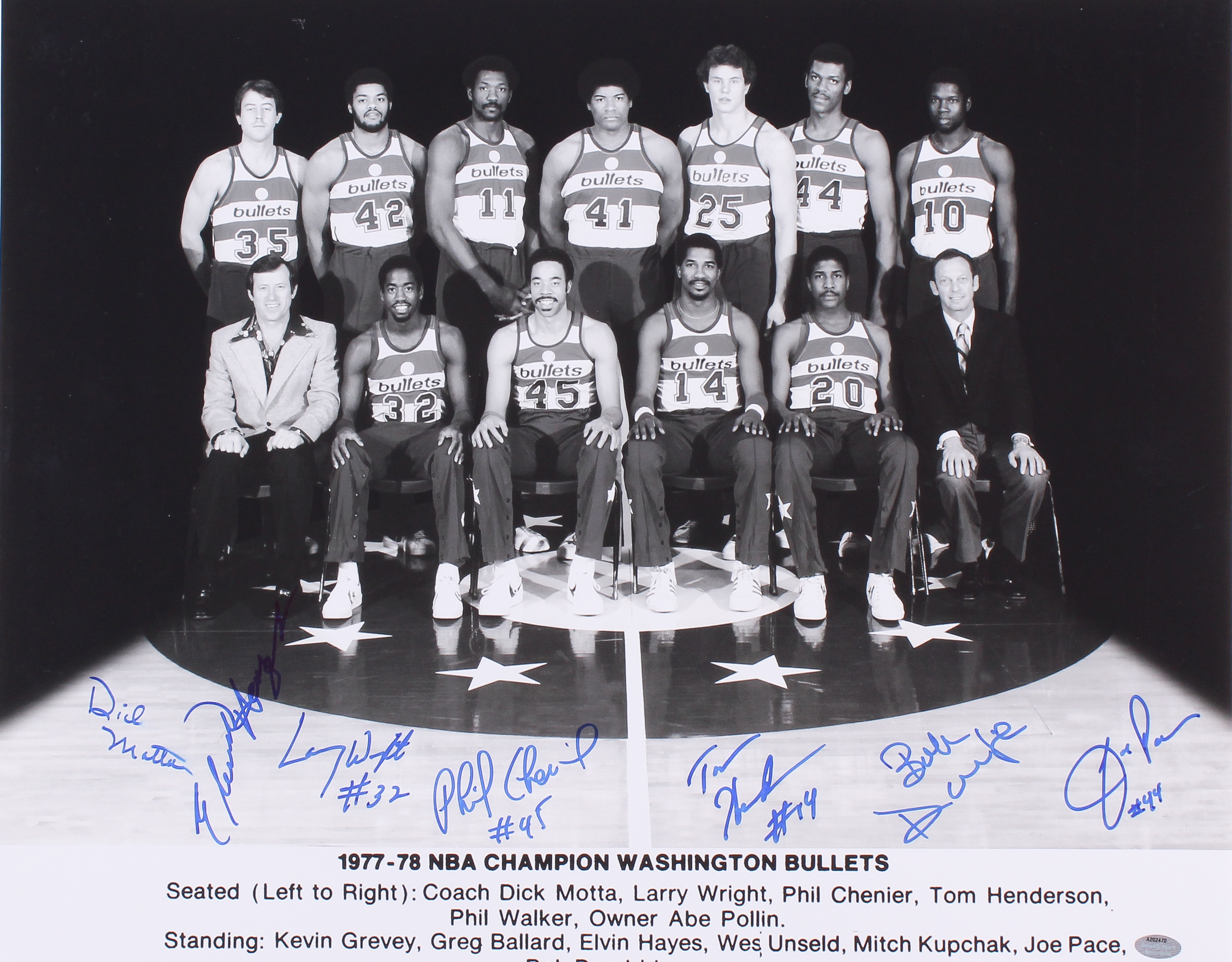 Photo measures 16" x 20" in size and has been hand-signed in blue felt-tip pen by Dick Motta, Elvin Hayes (HOF), Phil Chenier, Tom Henderson, Bob Dandridge, Larry Wright and Joe Pace. Please note: Dick Motta's autograph is slightly smudged, see photos for details.