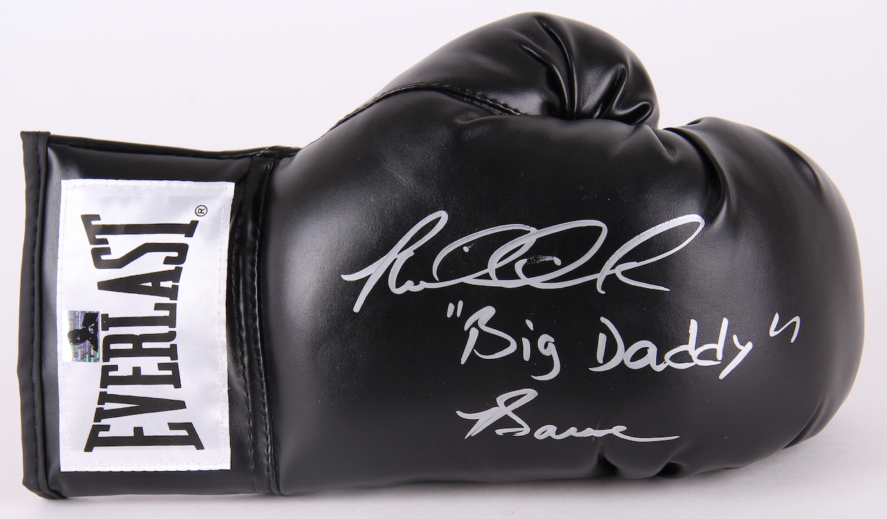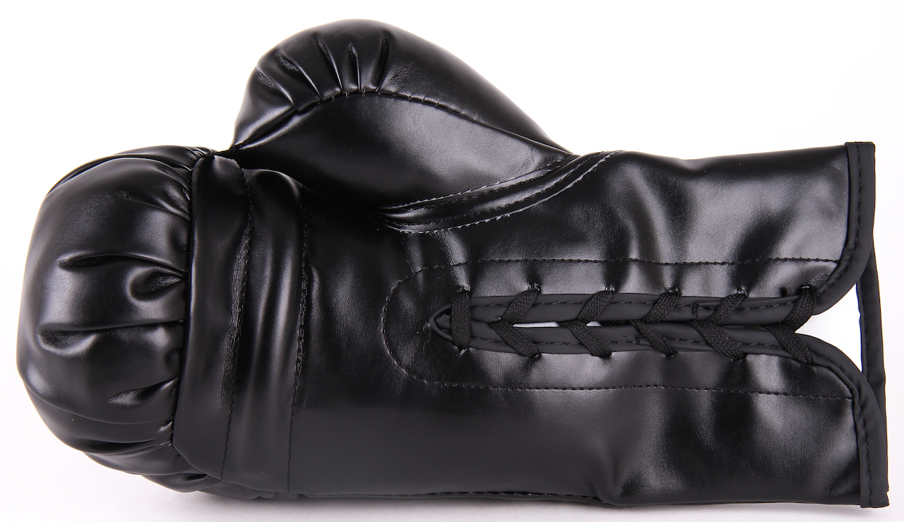 Black Everlast boxing glove. Hand-signed in silver paint pen by Riddick Bowe.