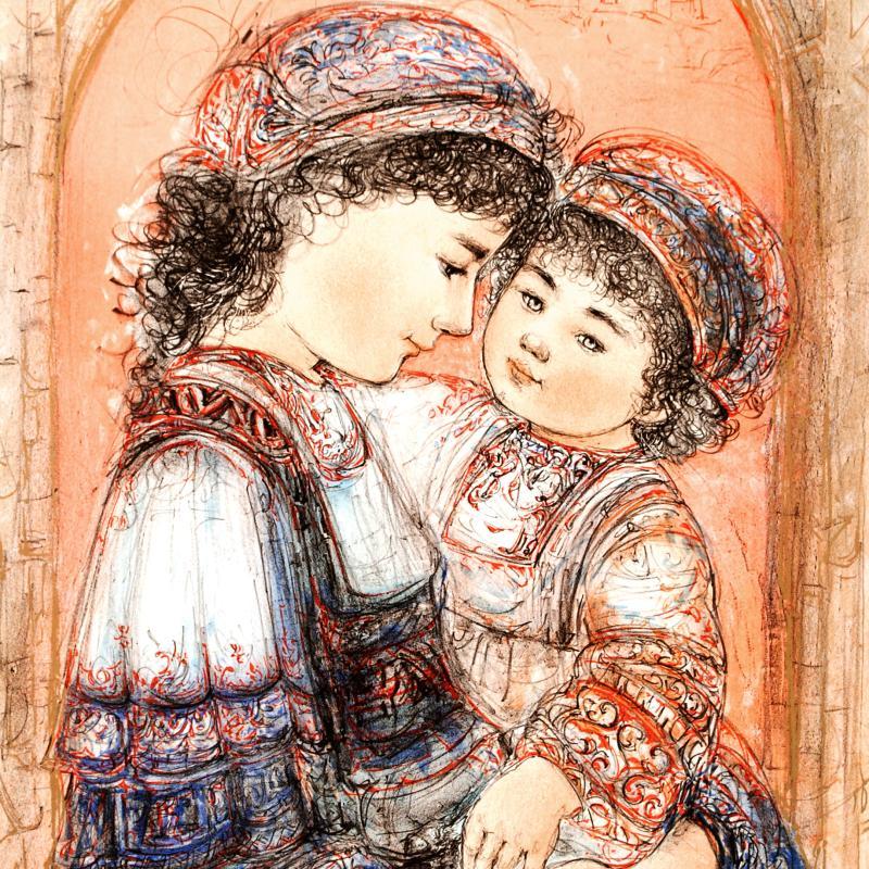 "Mother and Child of Thera" is a limited edition lithograph on paper, numbered and hand signed by Edna Hibel (1917-2014). Includes Certificate of Authenticity! Measures approx. 30" x 42" (with border), 26" x 39" (image).