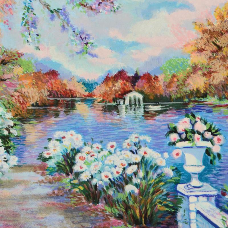 "Lac Fleuri" is a limited edition serigraph on canvas board by Zina Roitman, numbered and hand signed by the artist. Measures approximately 15" x 19" (with border), 14" x 18" (image).