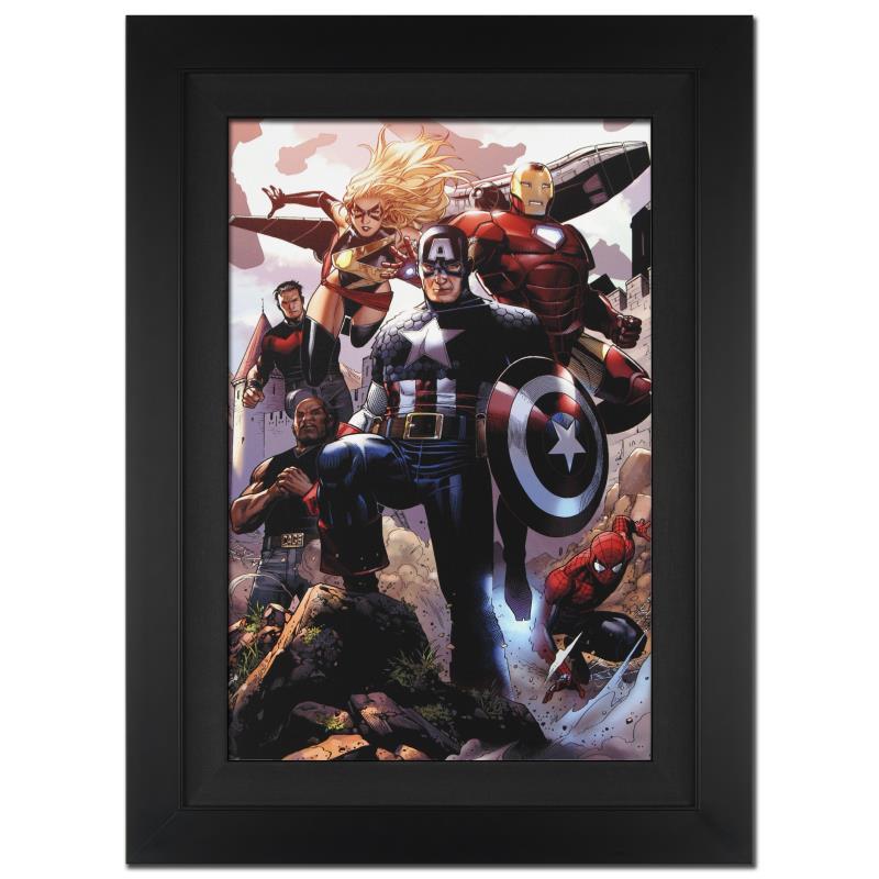 A piece of comic book history, this limited edition, from original art by Jim Cheung, depicts the classic characters Captain America, Spider-Man, and Iron Man. Jim Cheung was named as one of 2005's "Young Guns" by Marvel Editor-in-Chief Joe Quesada, and has been described as a "future superstar penciller." "Avengers: The Children's Crusade #4" is an extremely limited edition numbered giclee on canvas by Jim Cheung presented by Marvel Comics, hand signed by the great Stan Lee and numbered out of only 10! This piece comes custom framed and ready to hang. Measure approximately 25" x 34" (with frame), 18" x 27" (image).