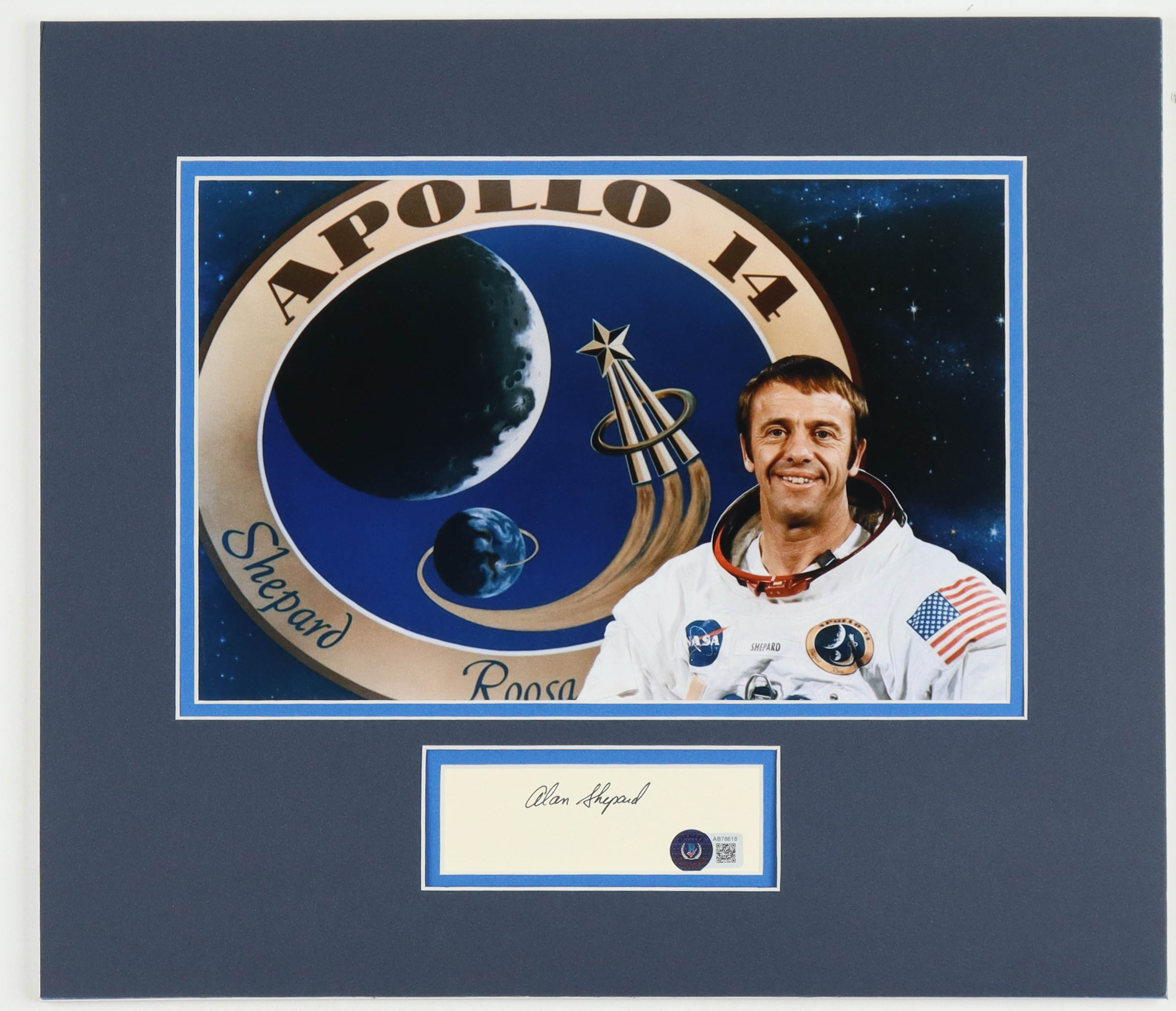 Custom matted display measures 14" x 16" in size and features a cut that has been hand-signed by Alan Shepard (D. 1998).