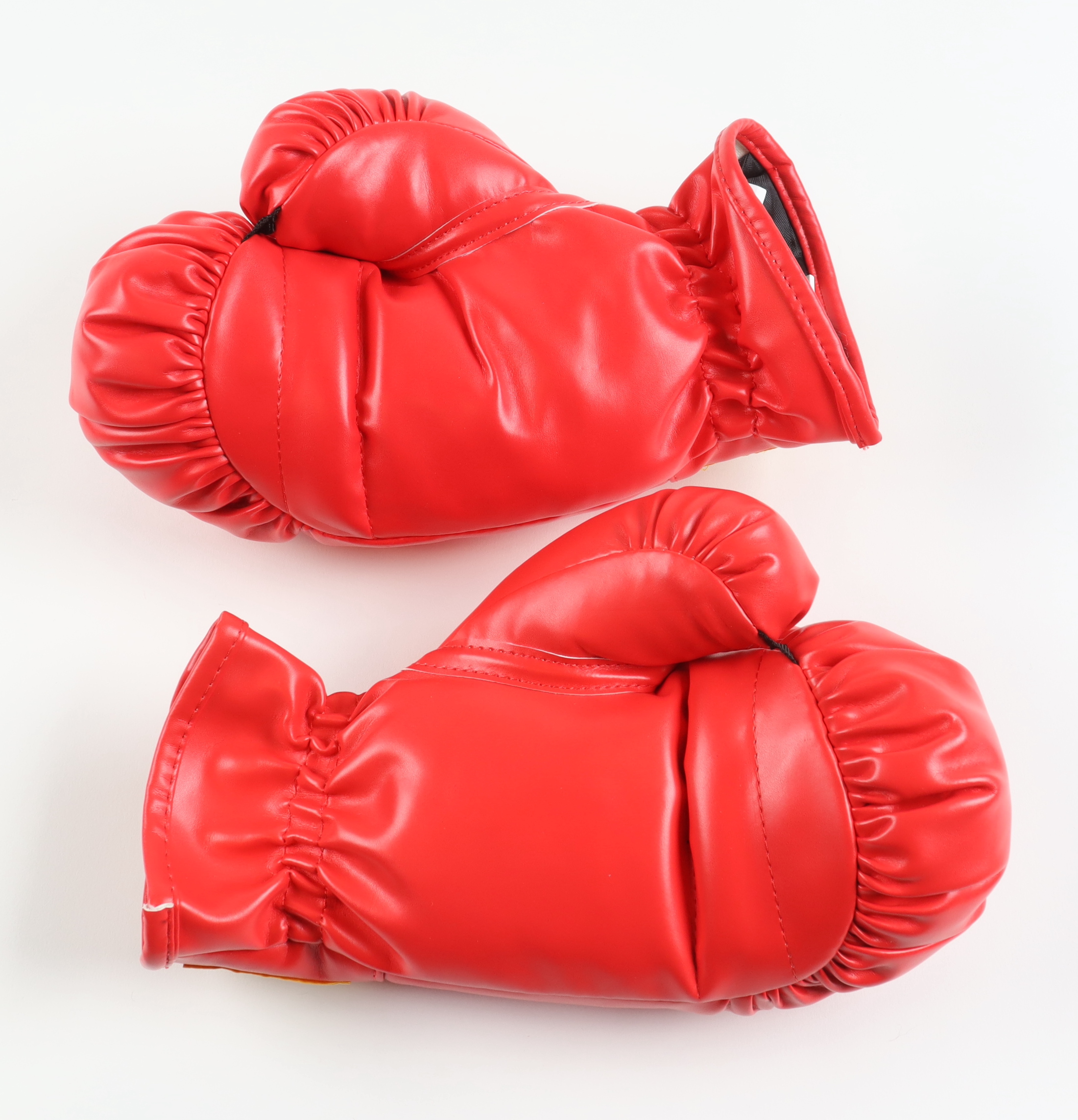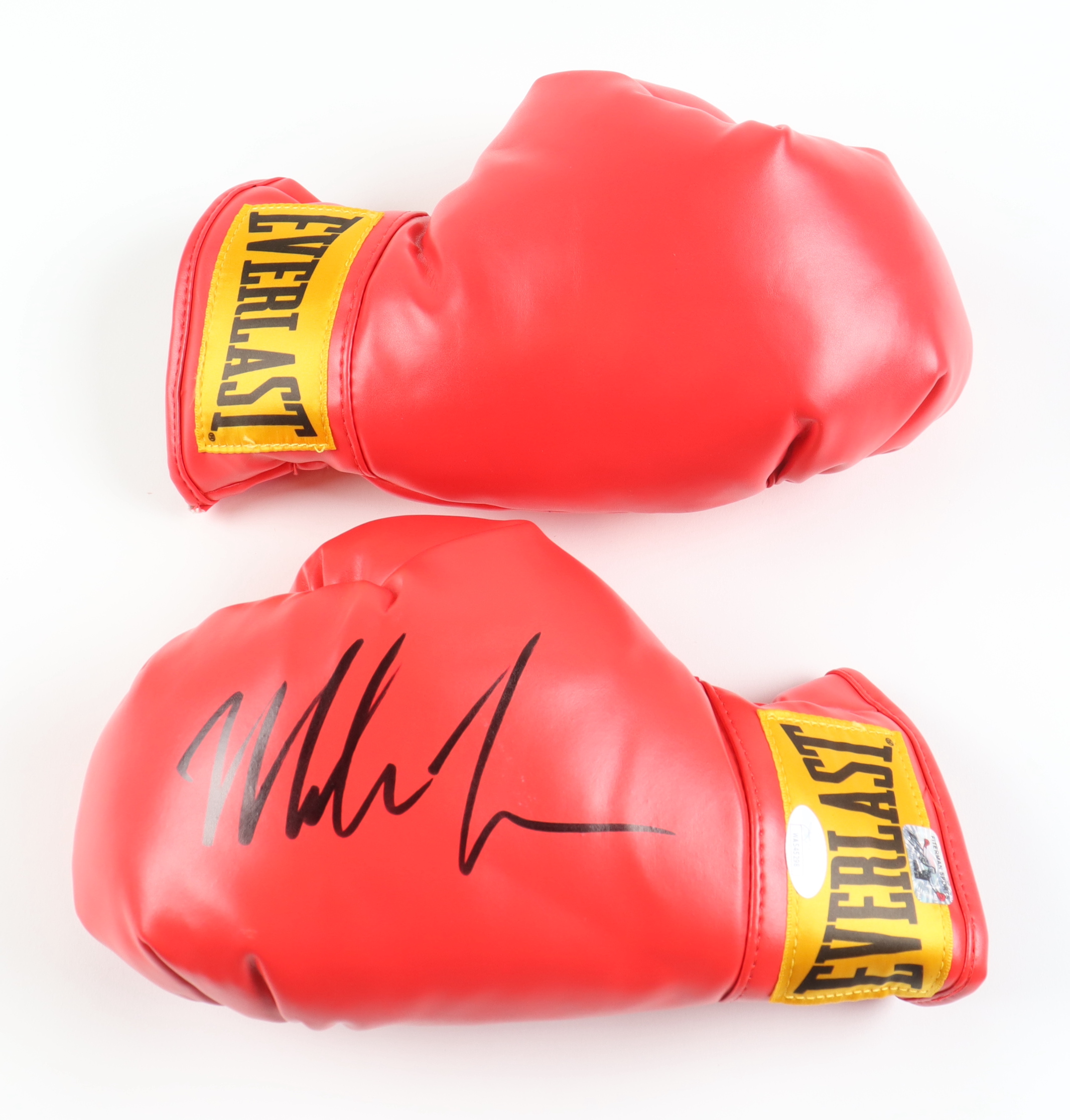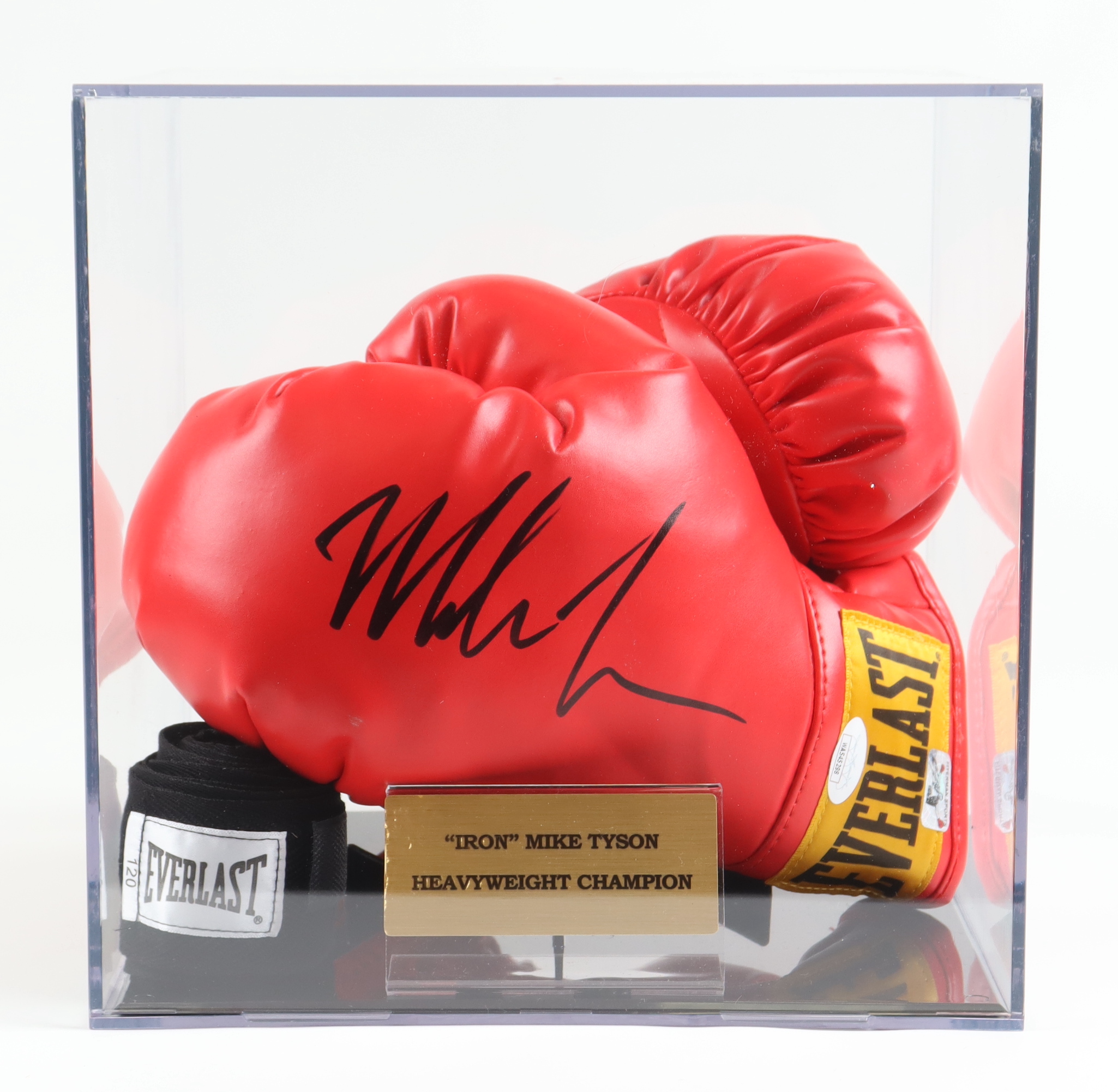 Pair of Everlast leather boxing gloves with display case. The left glove has been hand-signed by Mike Tyson (HOF).