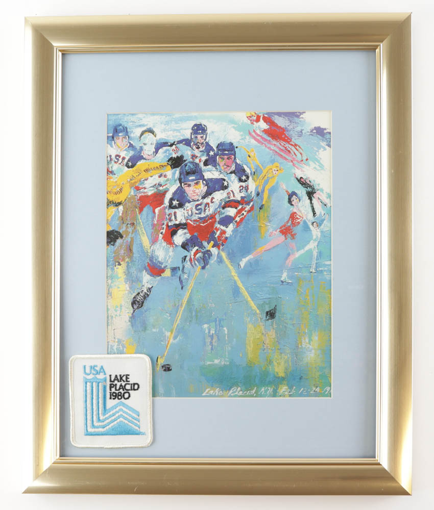 1980 US Olympic Hockey Team "Miracle on Ice" Custom Framed Leroy Neiman Vintage Print Display with Vintage 1980 Lake Placid Patch
