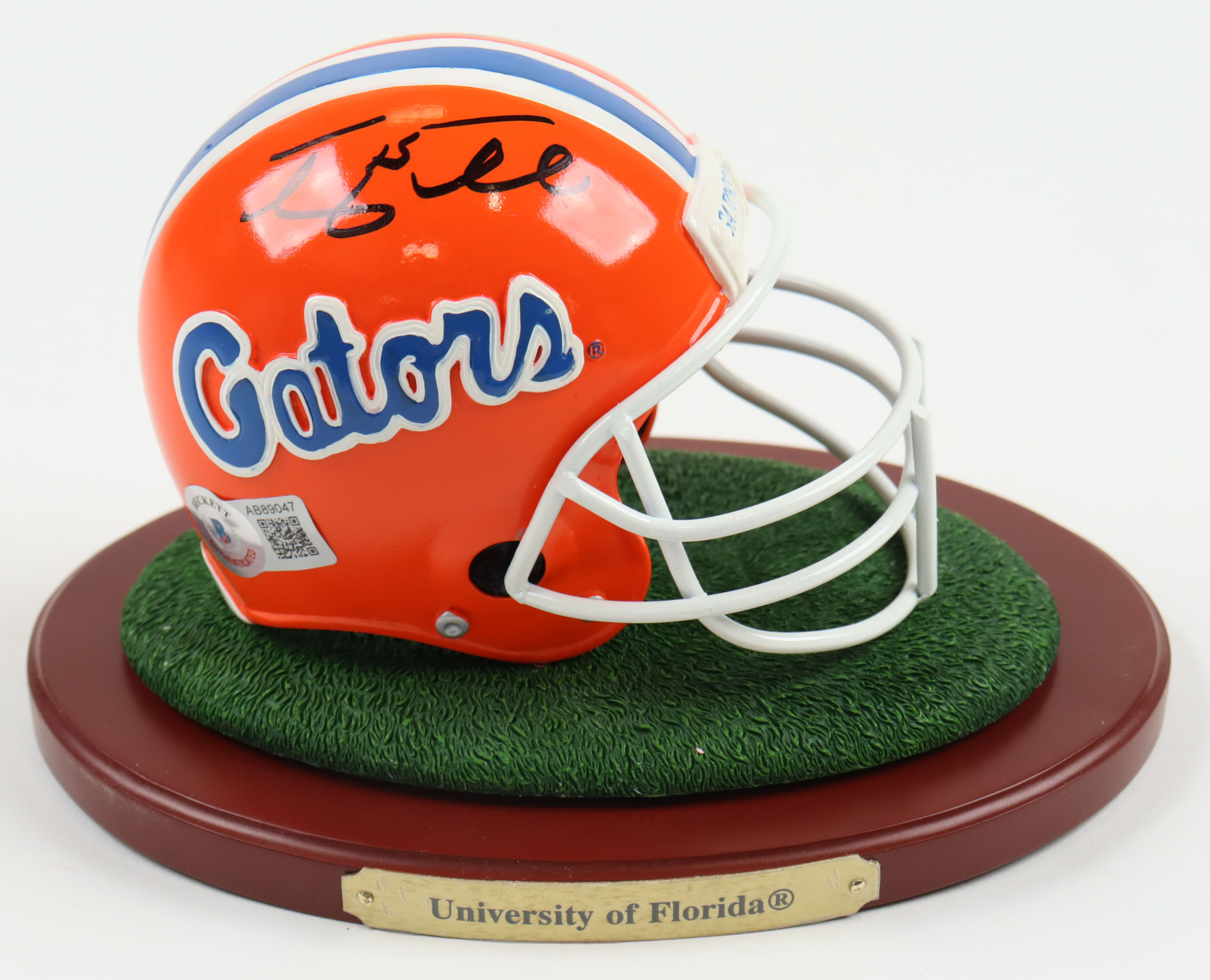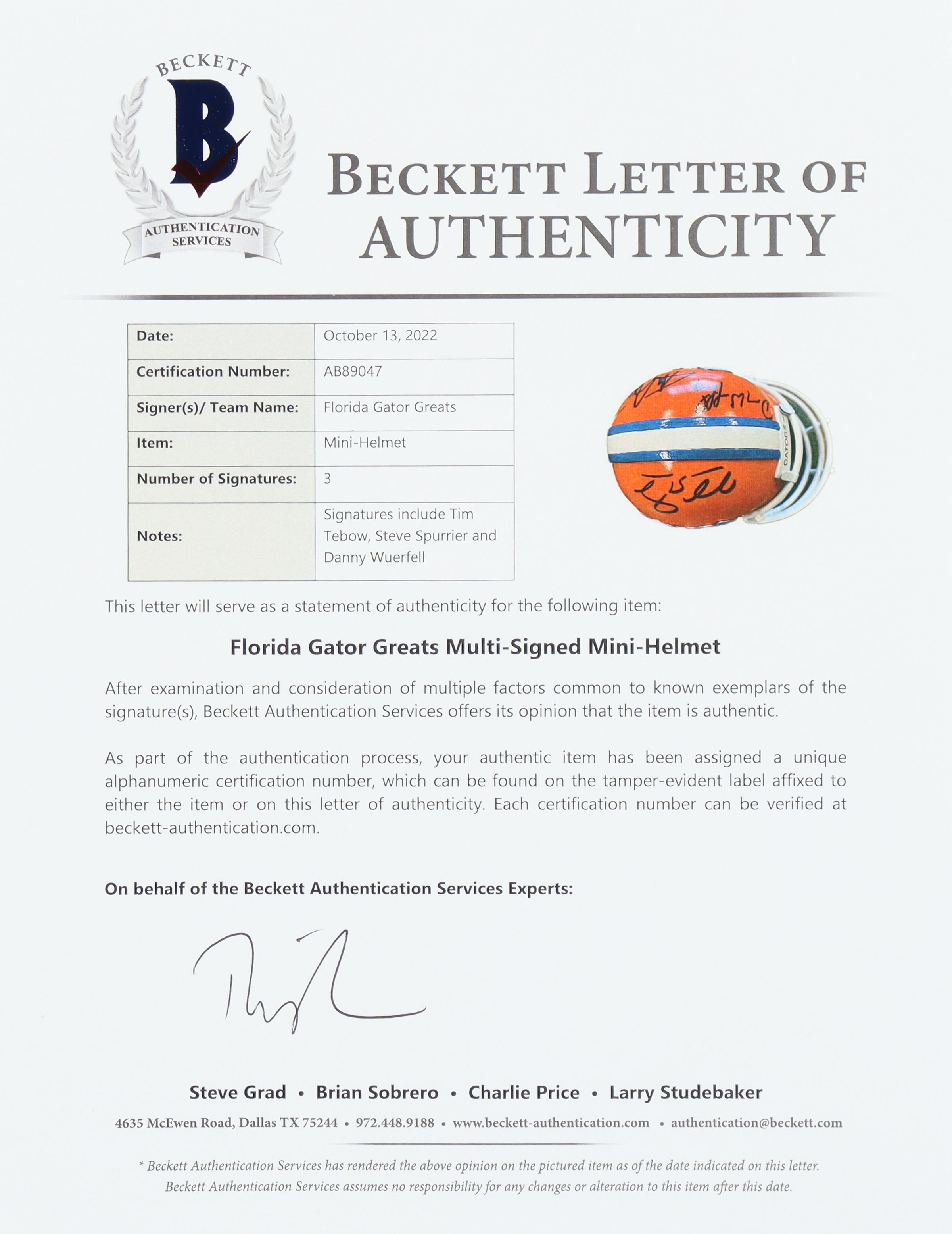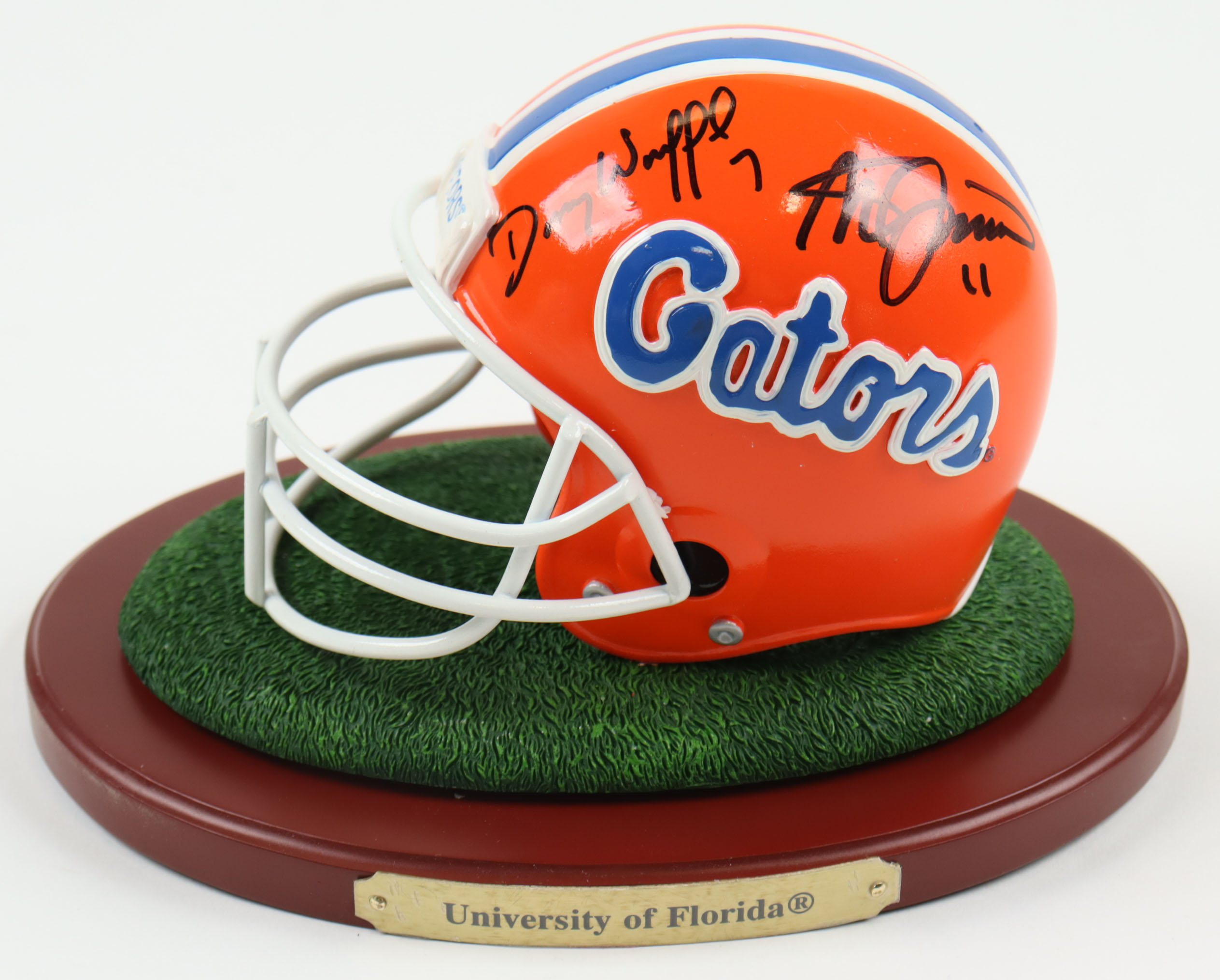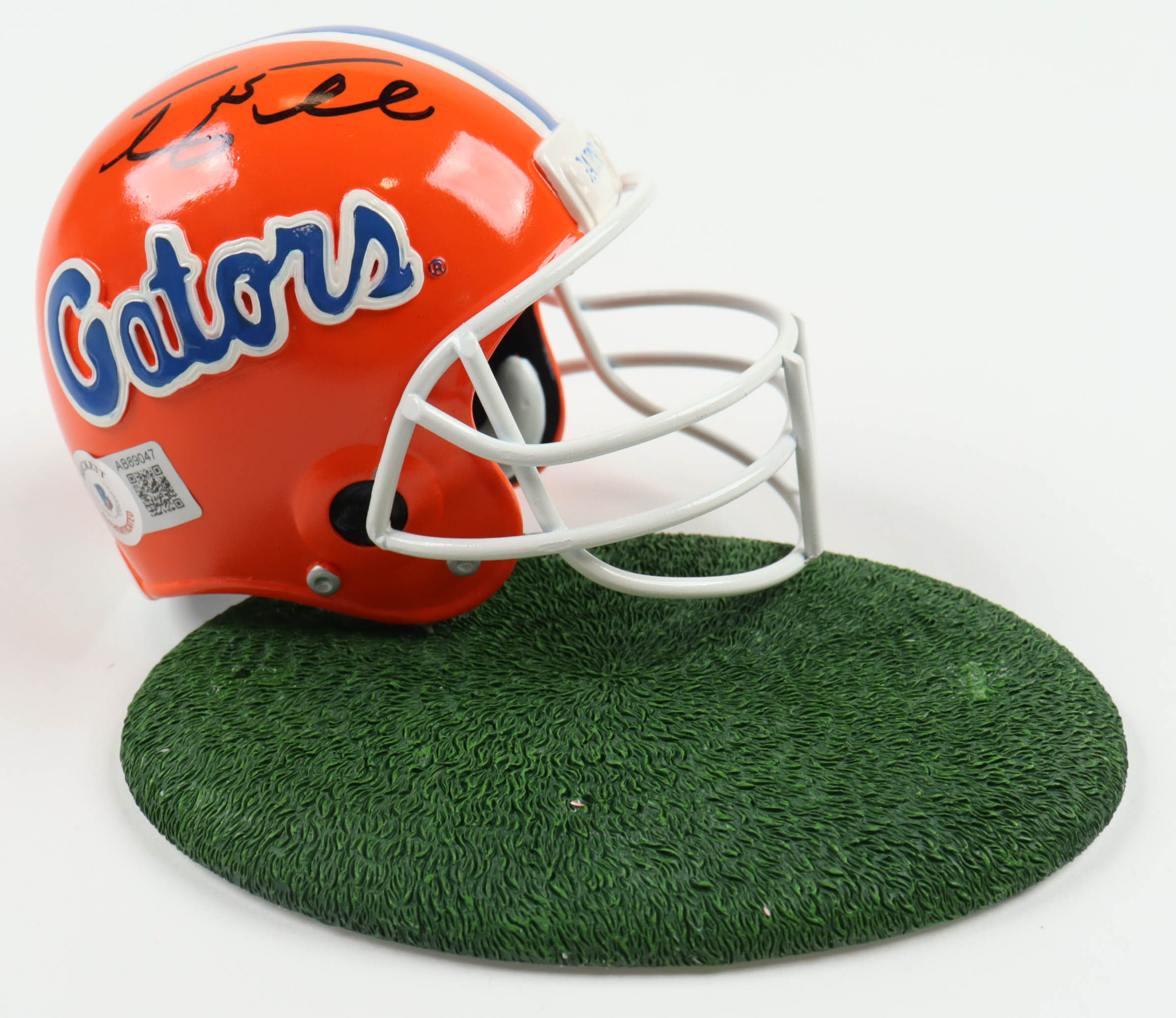 Ceramic mini helmet measures 4" in height and has been hand-signed by Tim Tebow (Denver Broncos), Steve Spurrier (San Francisco 49ers), and Danny Wuerfell (New Orleans Saints). This item is limited edition.