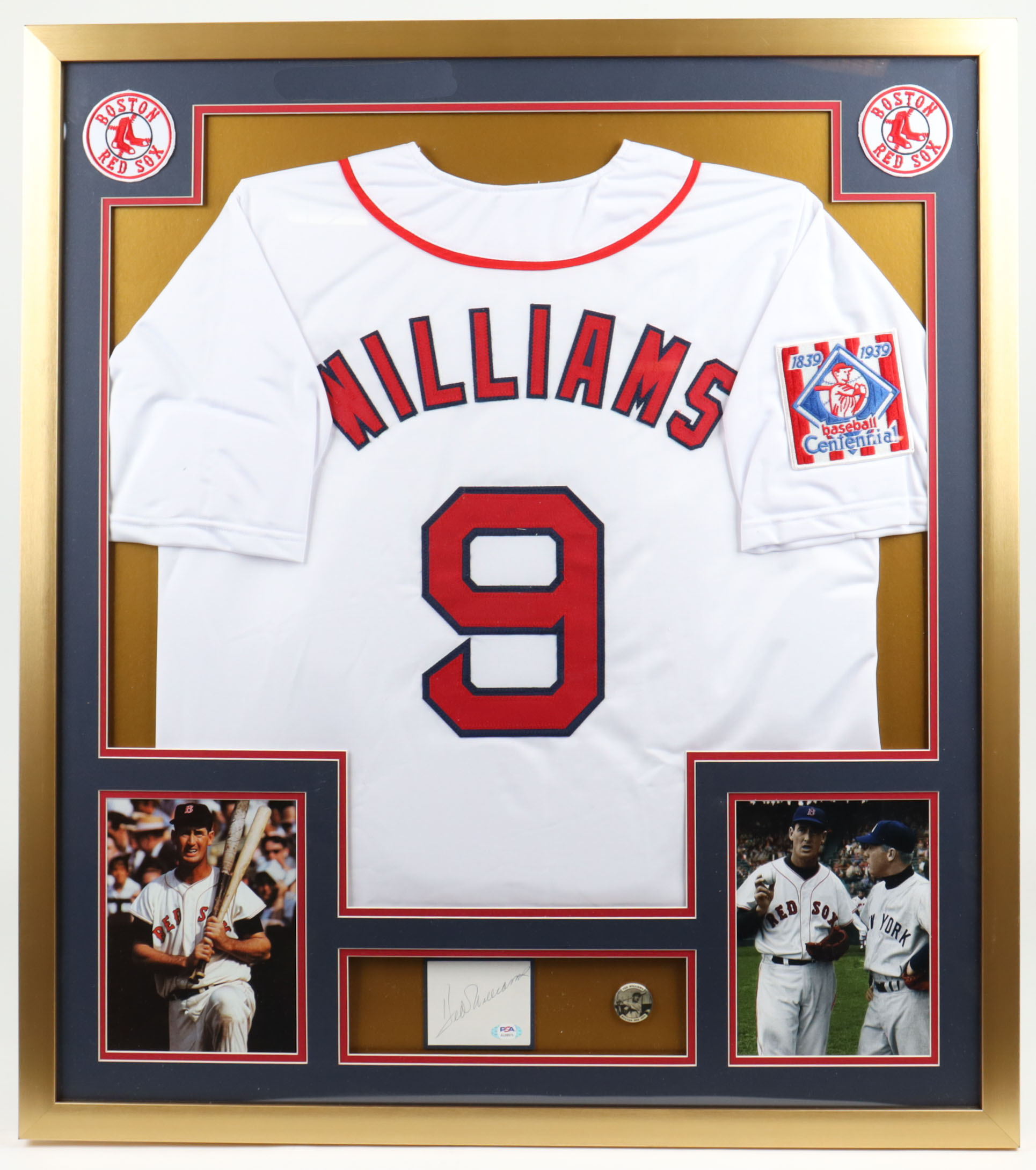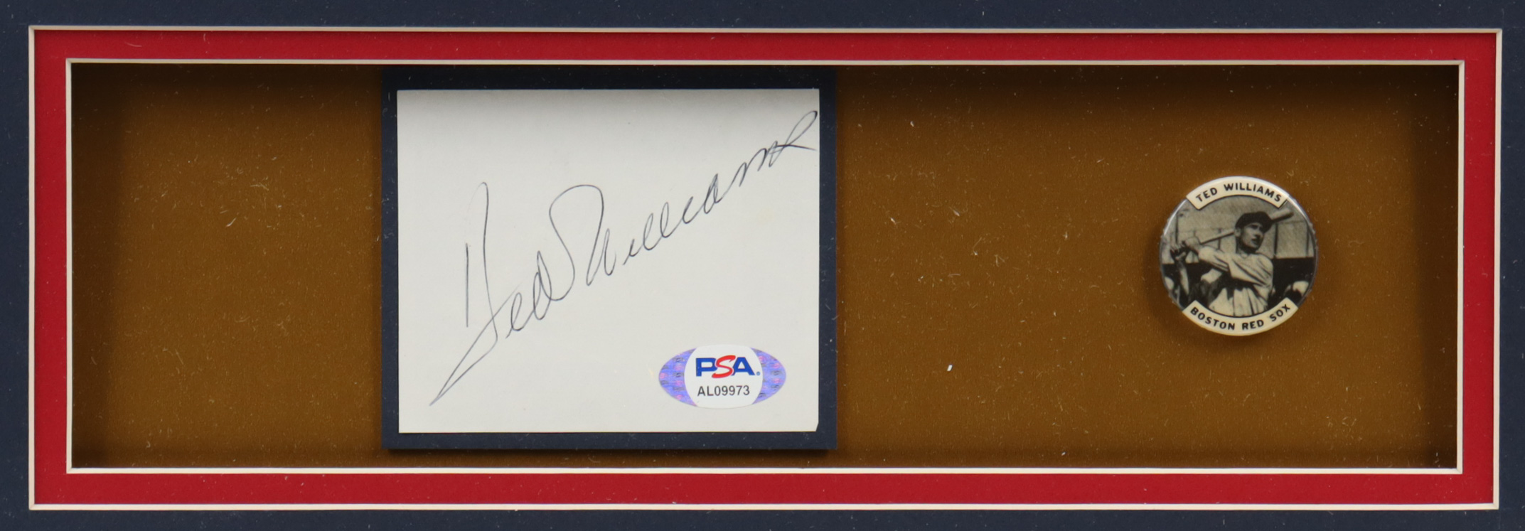 Ted Williams Signed 32x36 Custom Framed Cut Display with 1950's Vintage Ted Williams Lapel Pin (PSA)