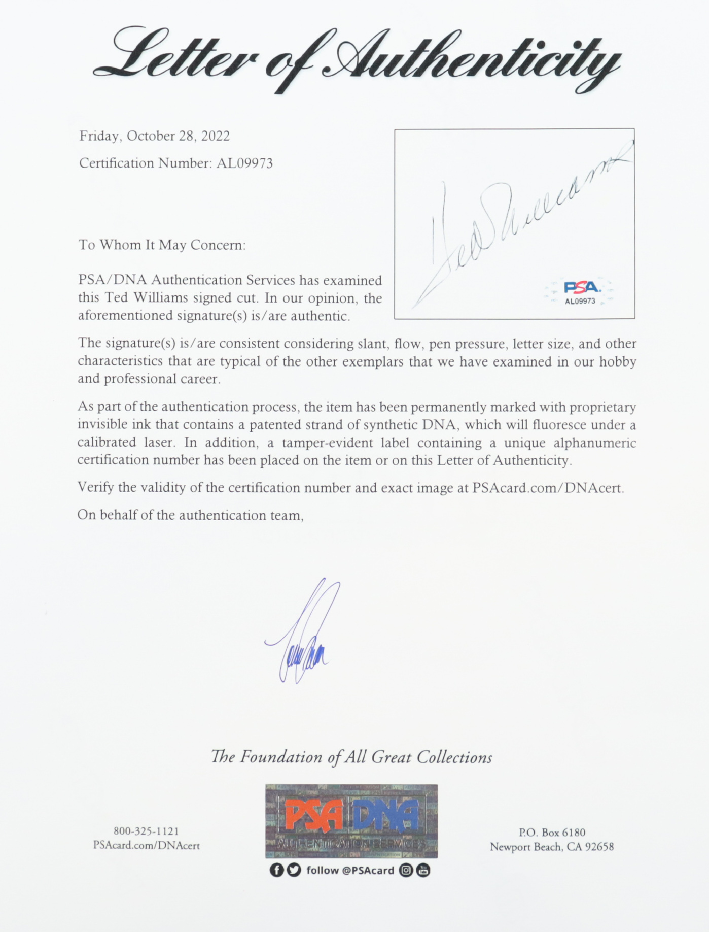 The lot / autograph(s) includes an official PSA/DNA hologram and matching LOA for authenticity purposes.