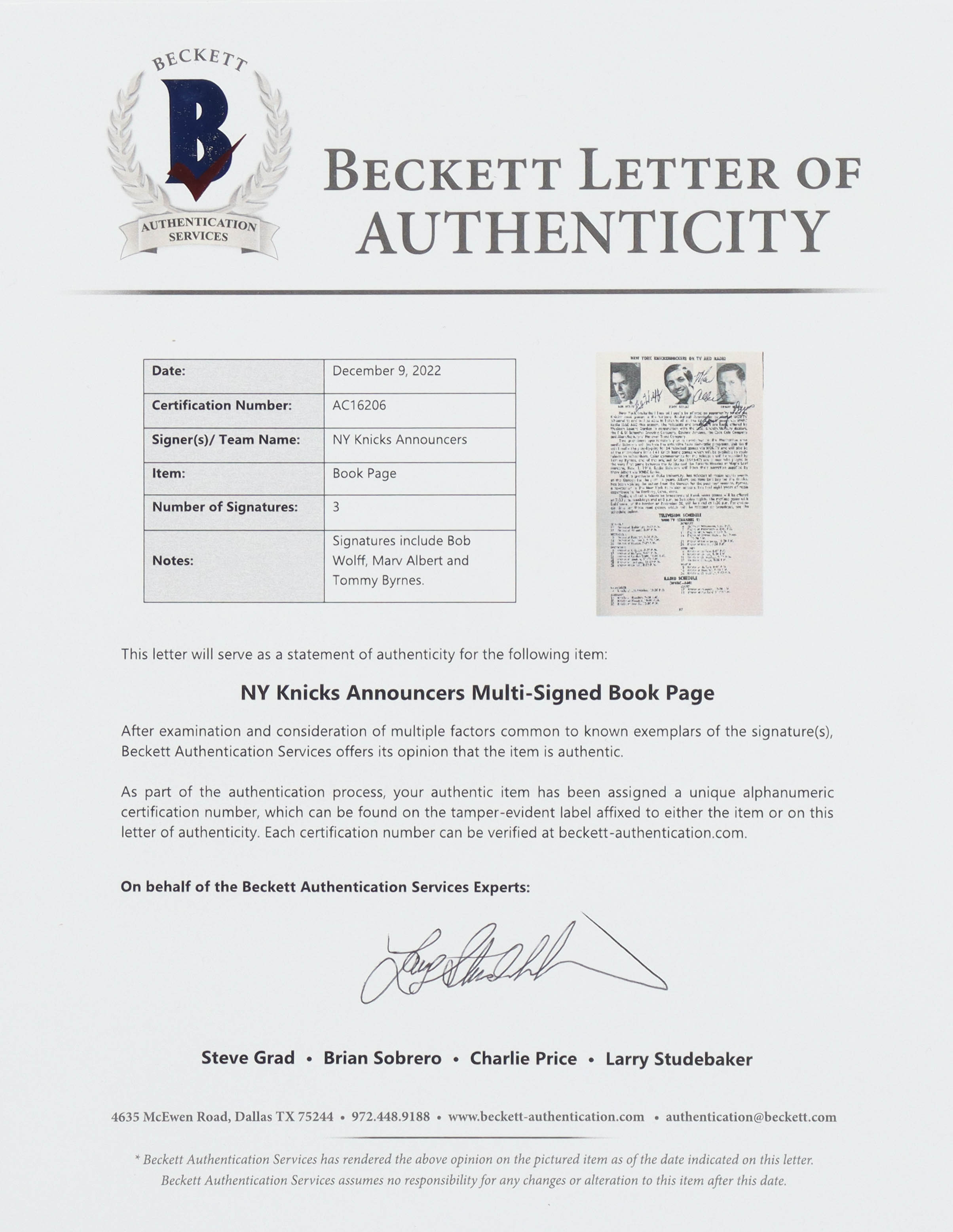 Knicks Announcers Multi-Signed 5x8 Book Page with Bob Wolff, Marv Albert & Tommy Byrnes (Beckett)