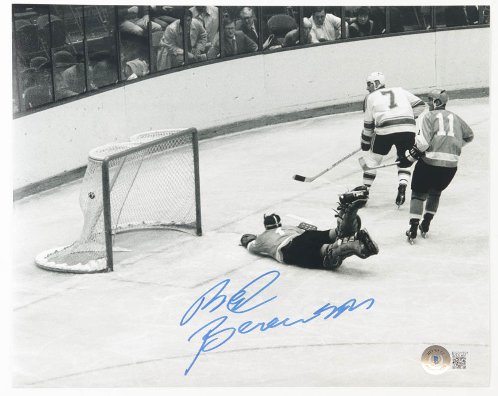 Photo measures 8" x 10" in size and has been hand-signed by Red Berenson (St. Louis Blues).