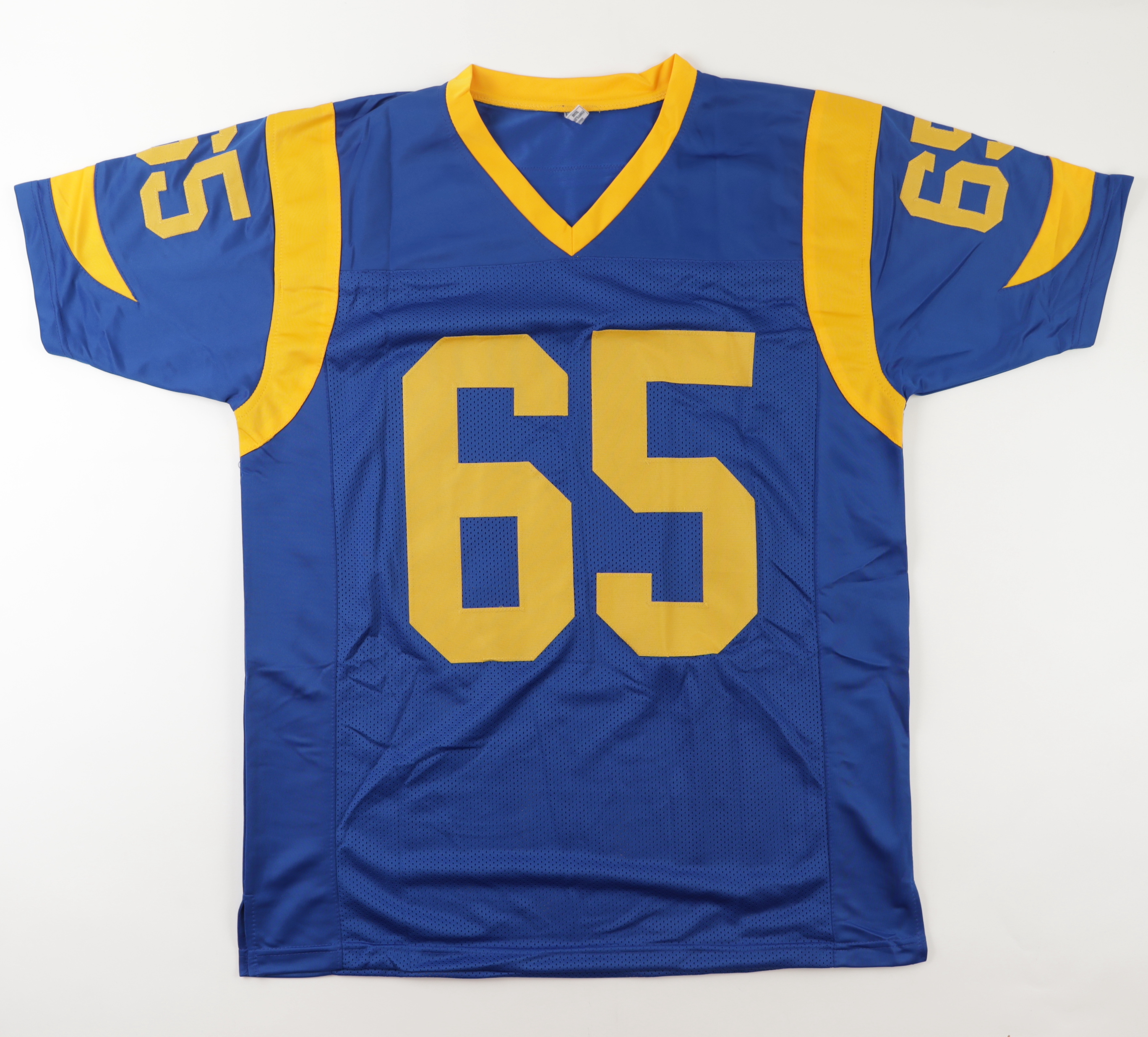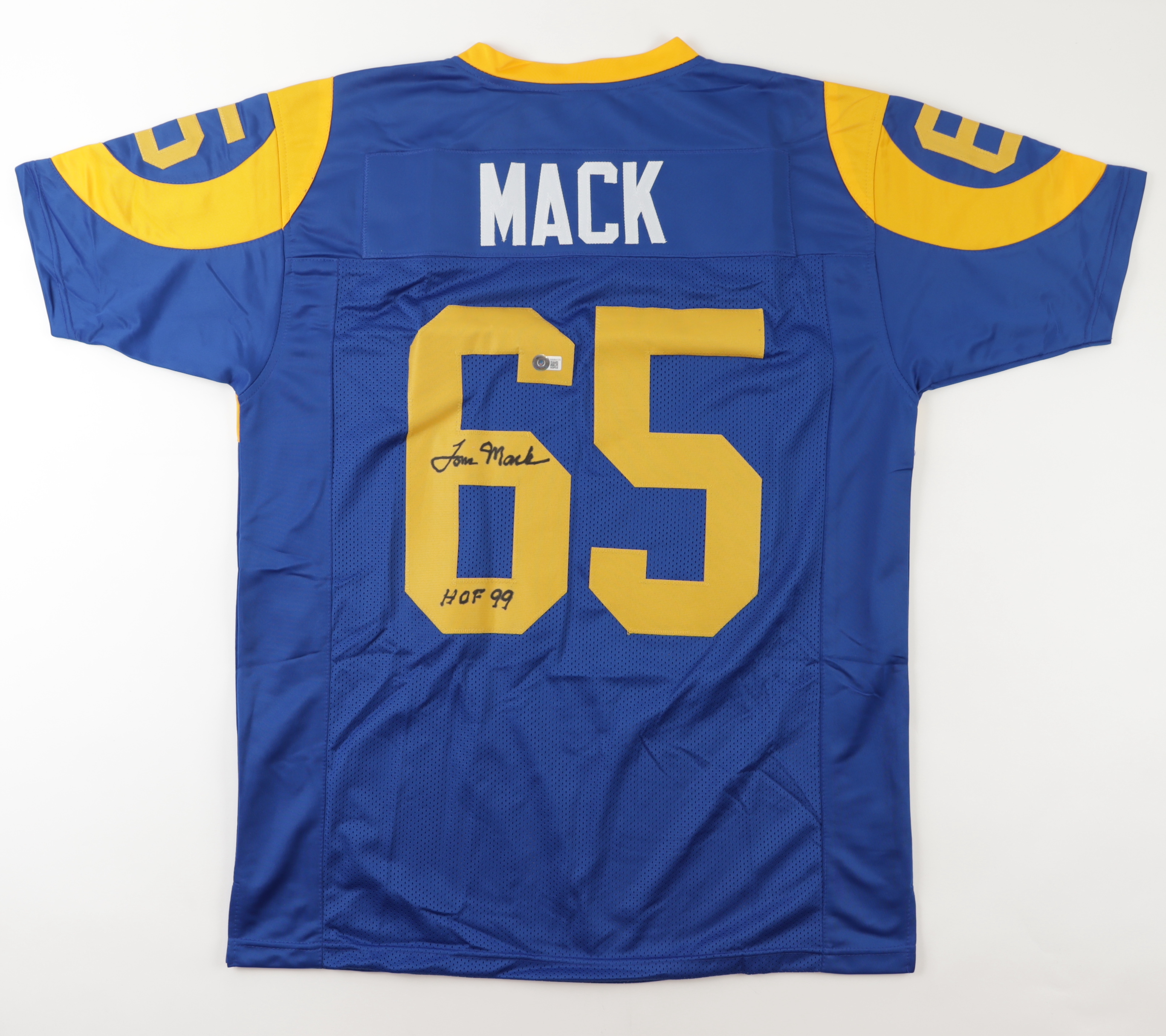 Custom on-field style jersey. Everything is sewn on, size XL. Hand-signed and inscribed by Tom Mack (HOF).