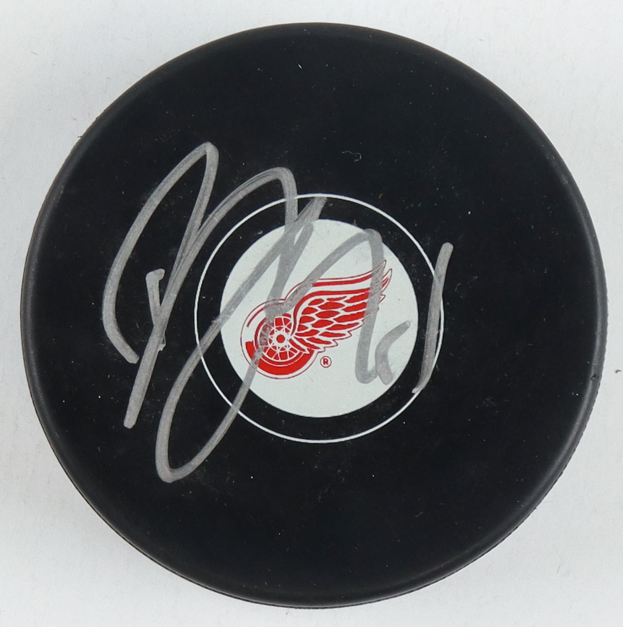 Detroit Red Wings Logo Hockey Puck. Hand-signed by Dylan Larkin.