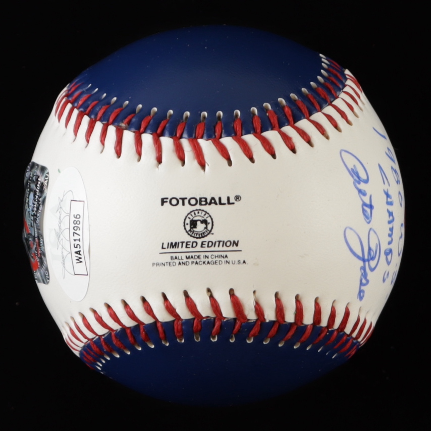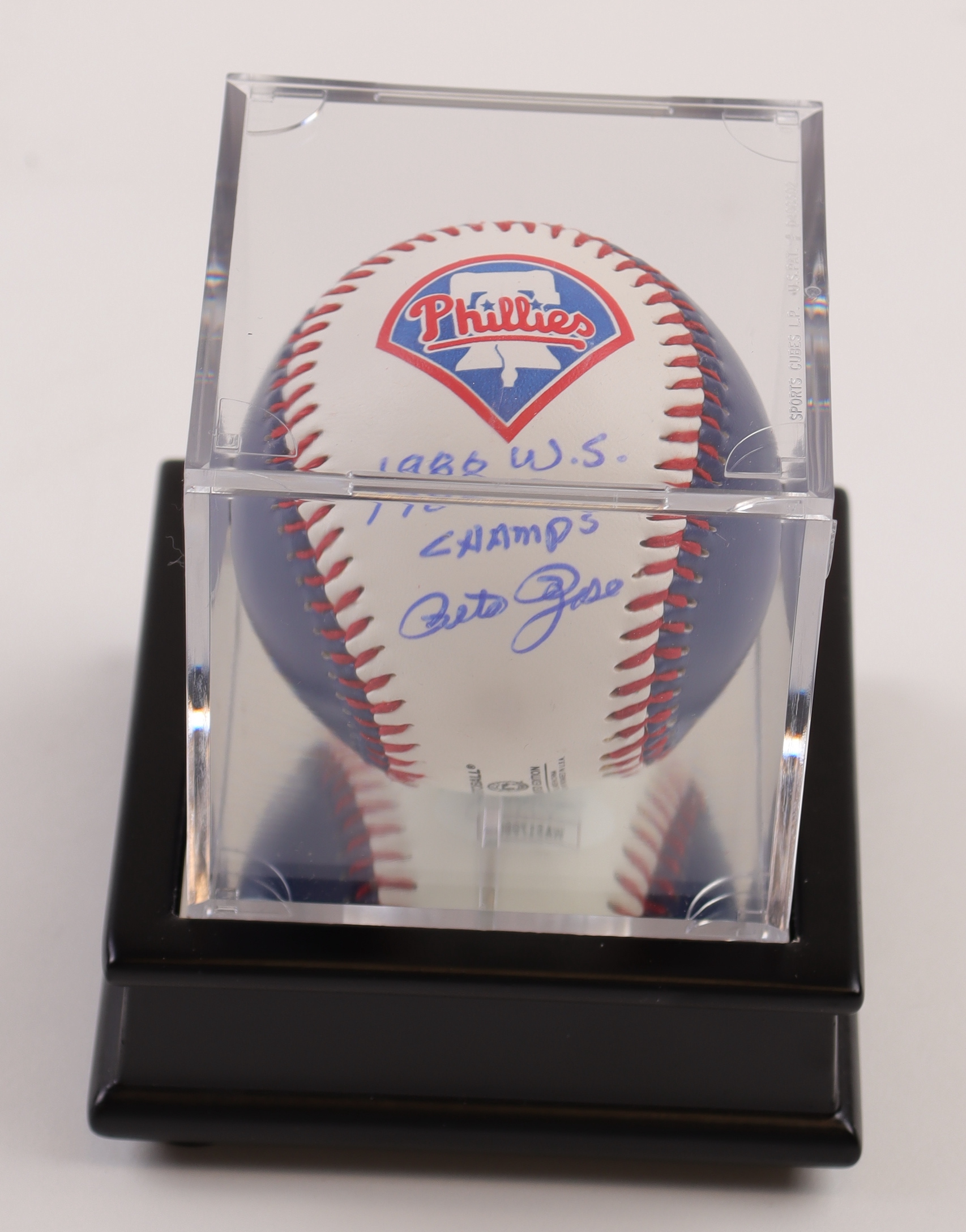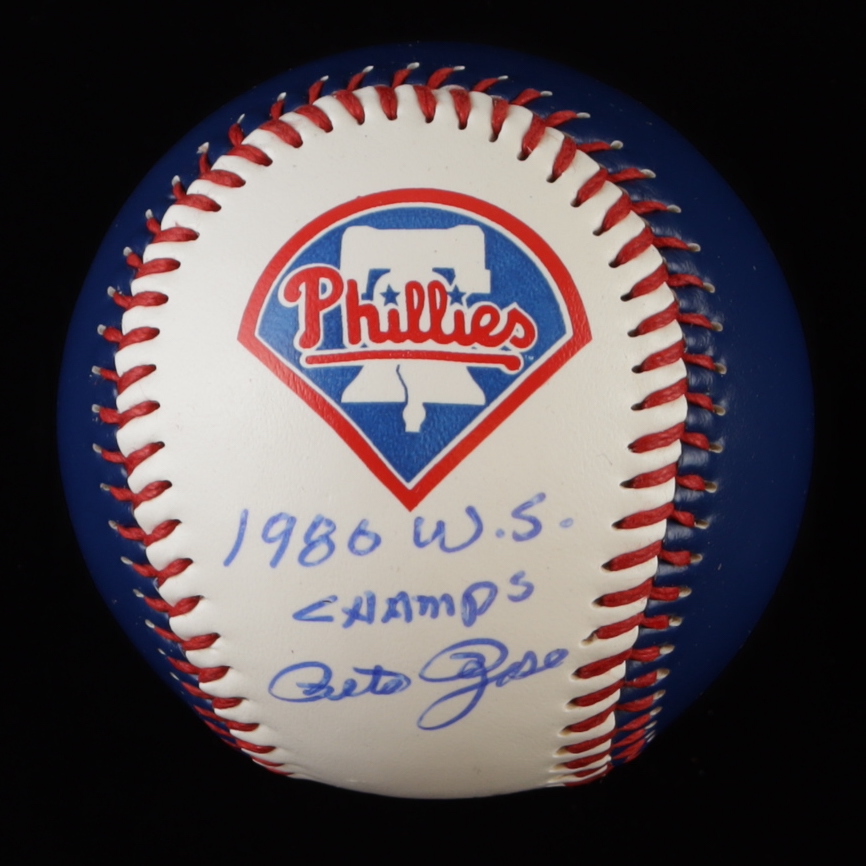 Fotoball Philadelphia Phillies baseball has been hand-signed and inscribed by Pete Rose. Includes display case as shown.