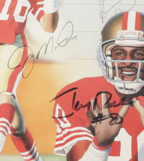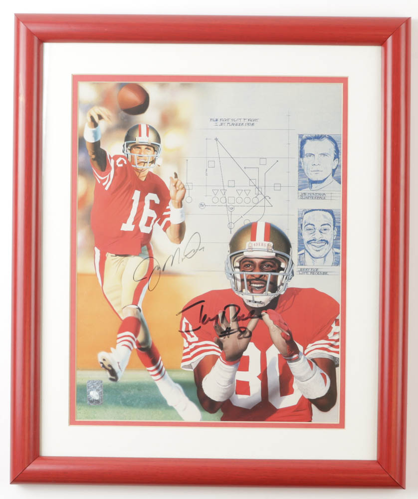 Custom frame measures 16" x 19" in size and features a photo that has been hand-signed by Joe Montana (San Francisco 49ers, HOF) and Jerry Rice (San Francisco 49ers, HOF).
