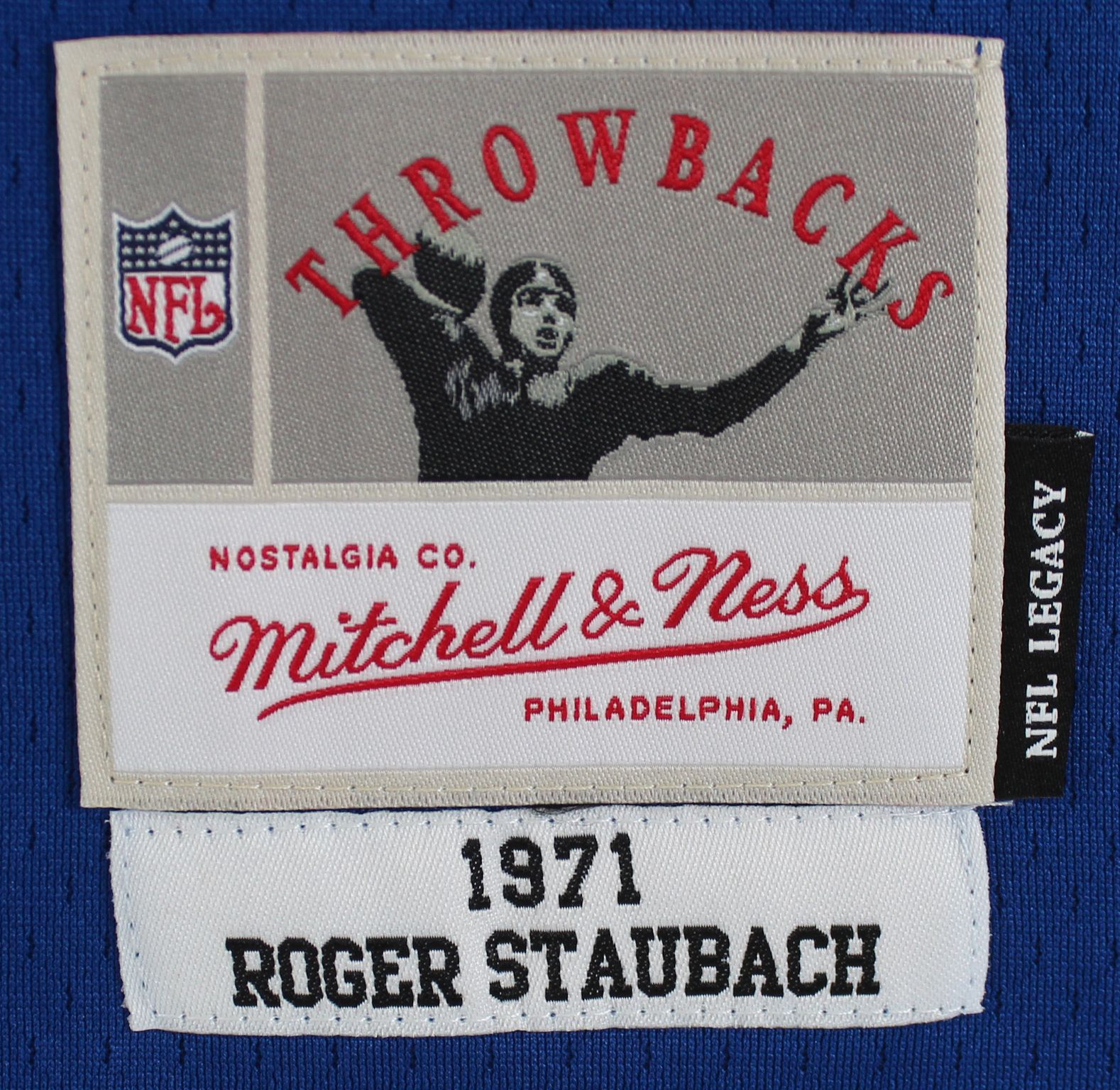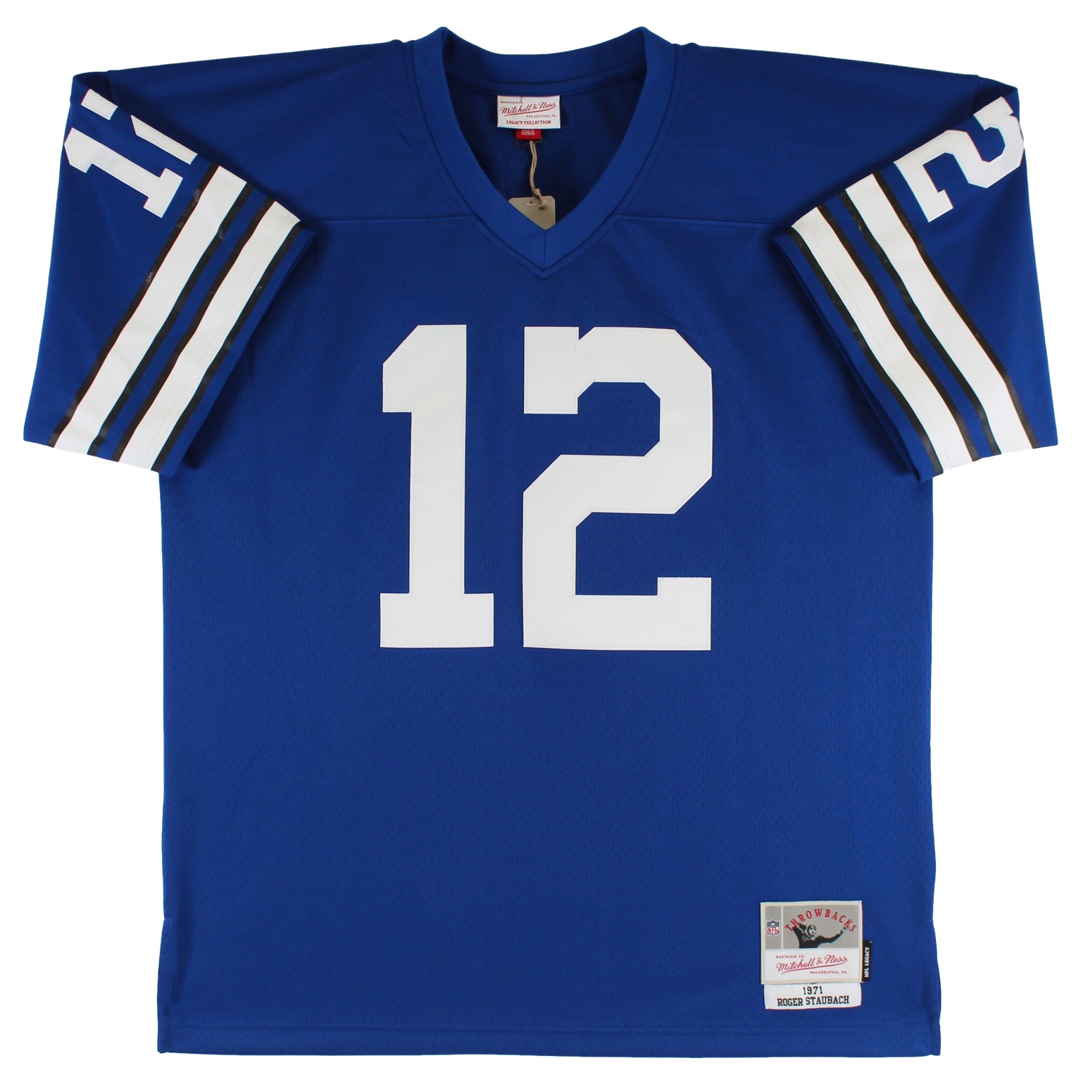 Mitchell & Ness Throwbacks style jersey. Everything is sewn on, size 48. Hand-signed and inscribed by Roger Staubach (Dallas Cowboys, HOF).