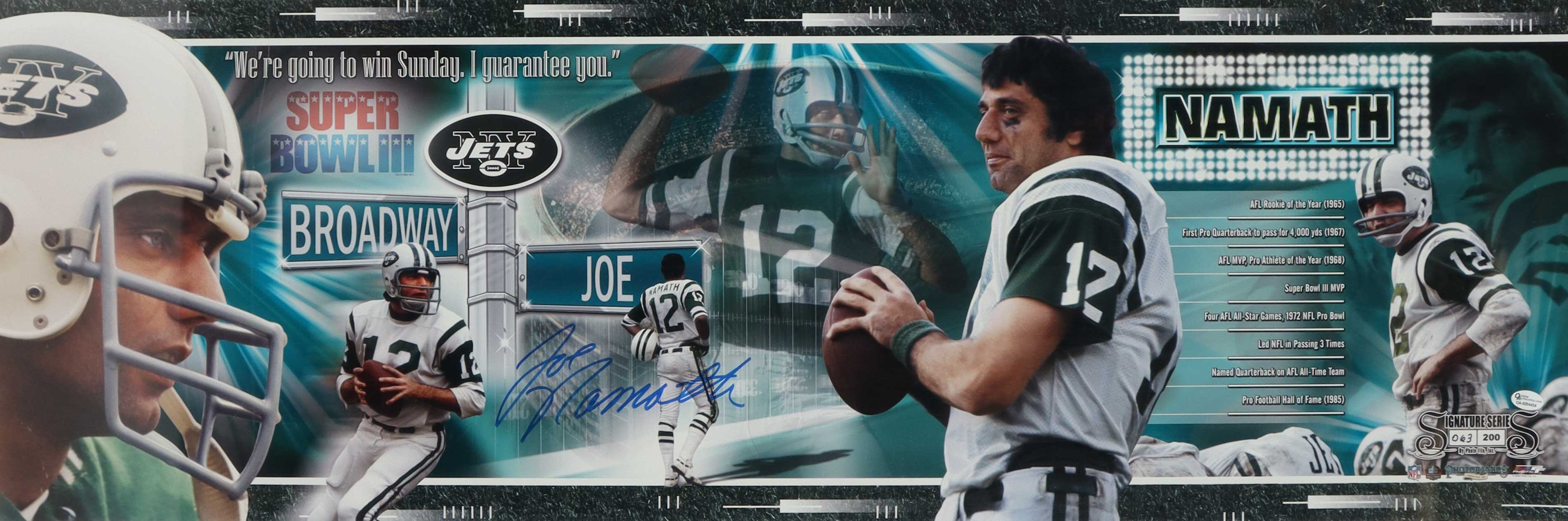 Lithograph measures 12" x 36" in size. Hand-signed by Joe Namath. Lithograph is limited edition hand-numbered #063/200.