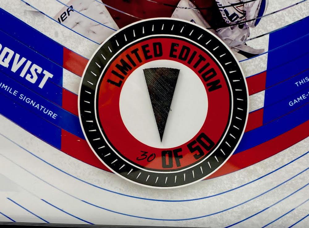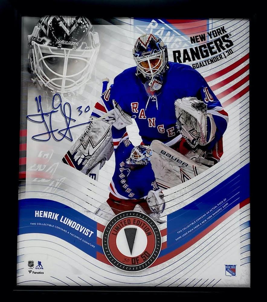 Custom framed display measures 15" x 17" in size and features a game-used hockey puck piece. Display is limited edition #30/50. Please note, the display includes a facsimile autograph of Henrik Lundqvist (New York Rangers).