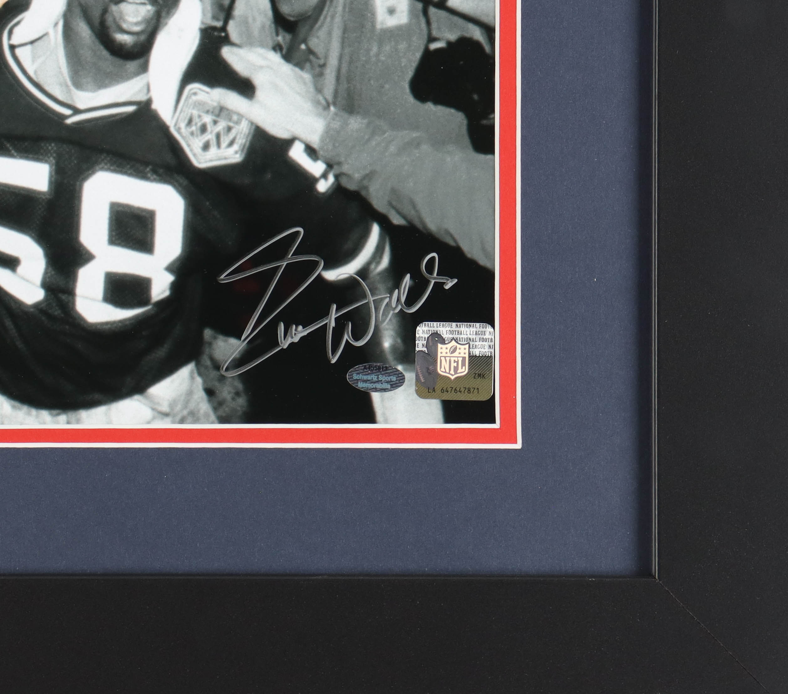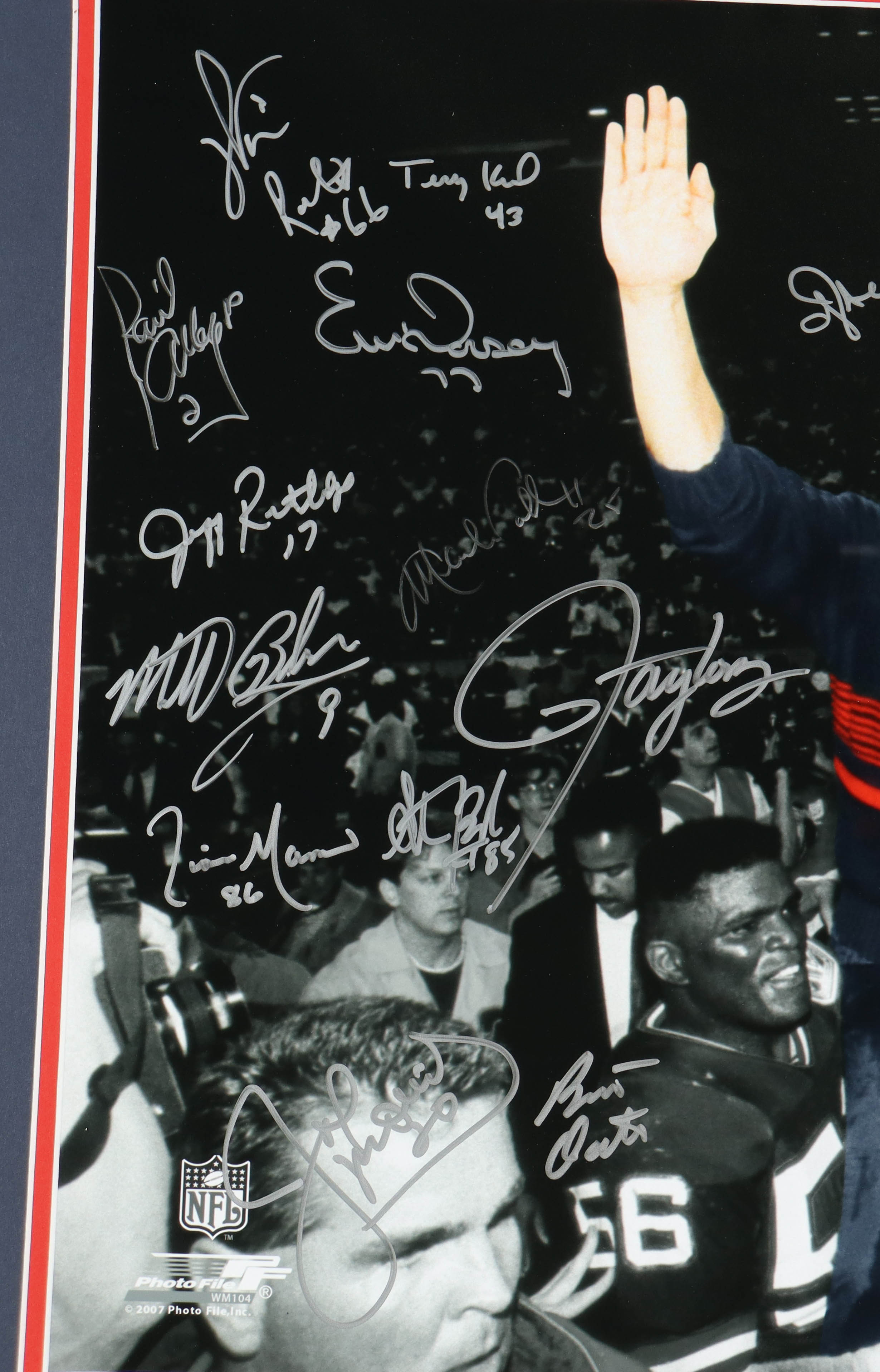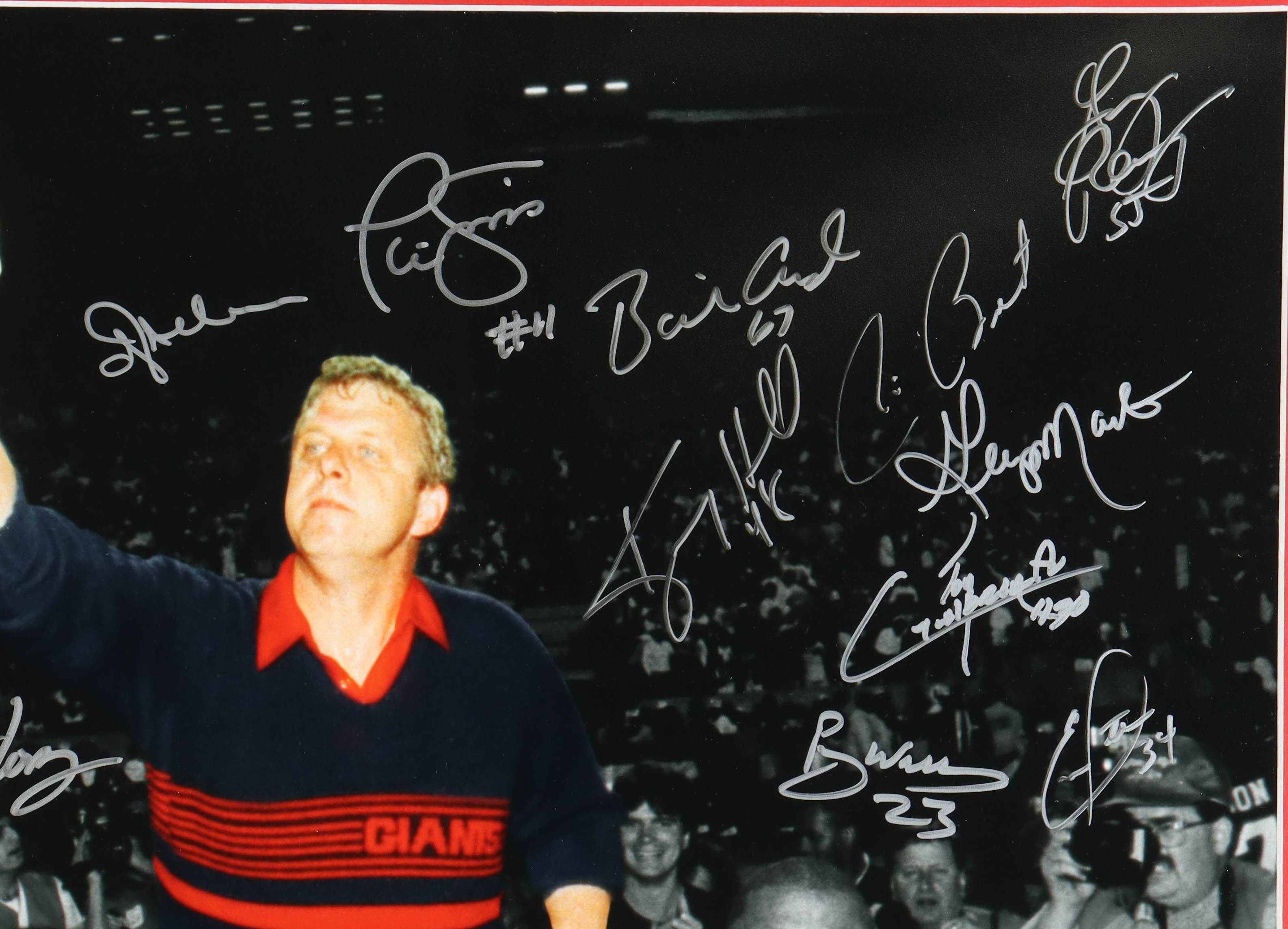 Custom frame measures 23.5" x 27.5" in size and features a photo that has been hand-signed by (23) members of the 1986 and 1990 New York Giants. Signers include Lawrence Taylor, Phil Simms, Ottis Anderson, Bart Oates, Perry Williams, Lionel Manuel, Raul Allegre, Eric Dorsey, Mark Collins, William Roberts, Gary Reasons, Joe Morris, Jim Burt, Jeff Rutledge, Terry Kinard, George Martin, Elvis Patterson, Kenny Hill, Tony Galbreath, Stephen Baker, Matt Bahr, Everson Walls, and Billy Ard.