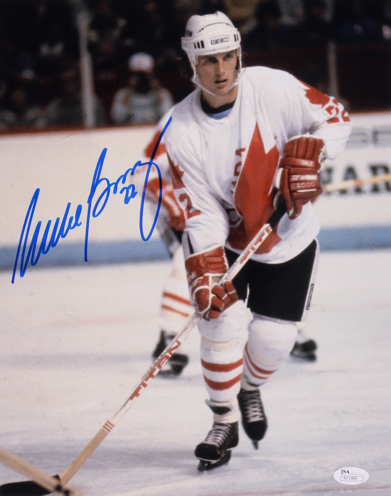 Photo measures 11" x 14" in size and is hand-signed in blue felt-tip pen by Mike Bossy (HOF).