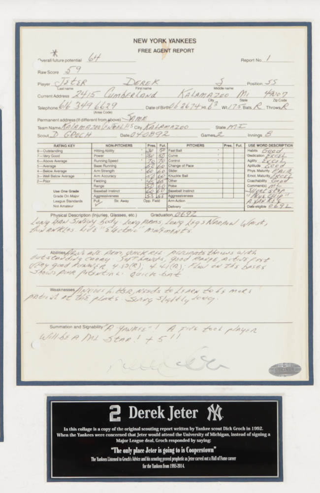 Custom framed display measures approximately 18" x 30" in size. Display includes (2) photos of as well as a replica scouting report that has been hand-signed by Derek Jeter (New York Yankees, HOF)
