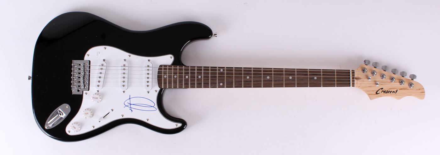 Crescent full-size electric guitar hand-signed on the pick guard in blue felt tip pen by Adam Levine (Lead Singer of Maroon 5).