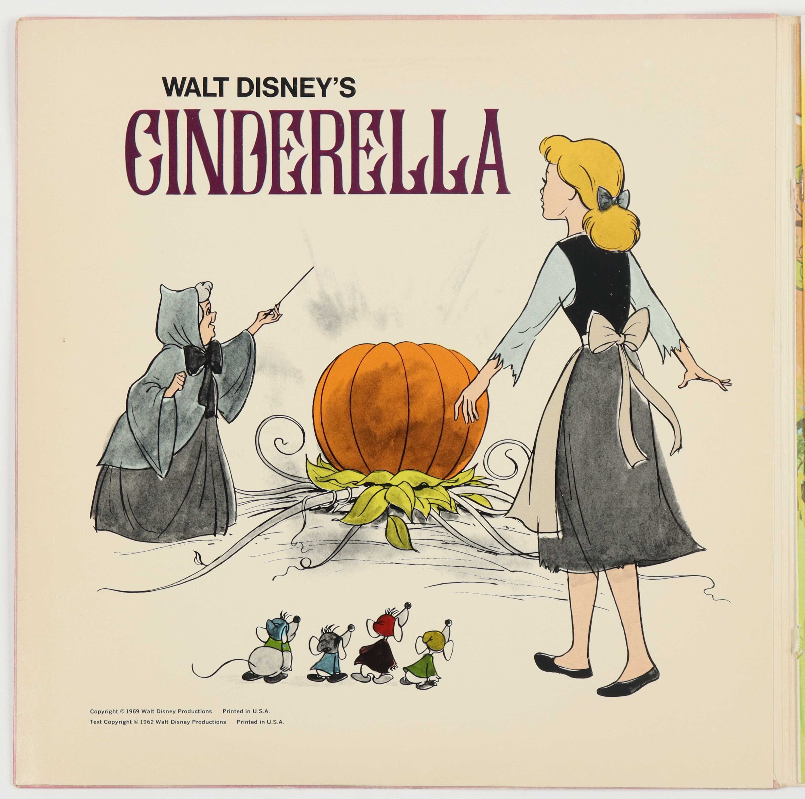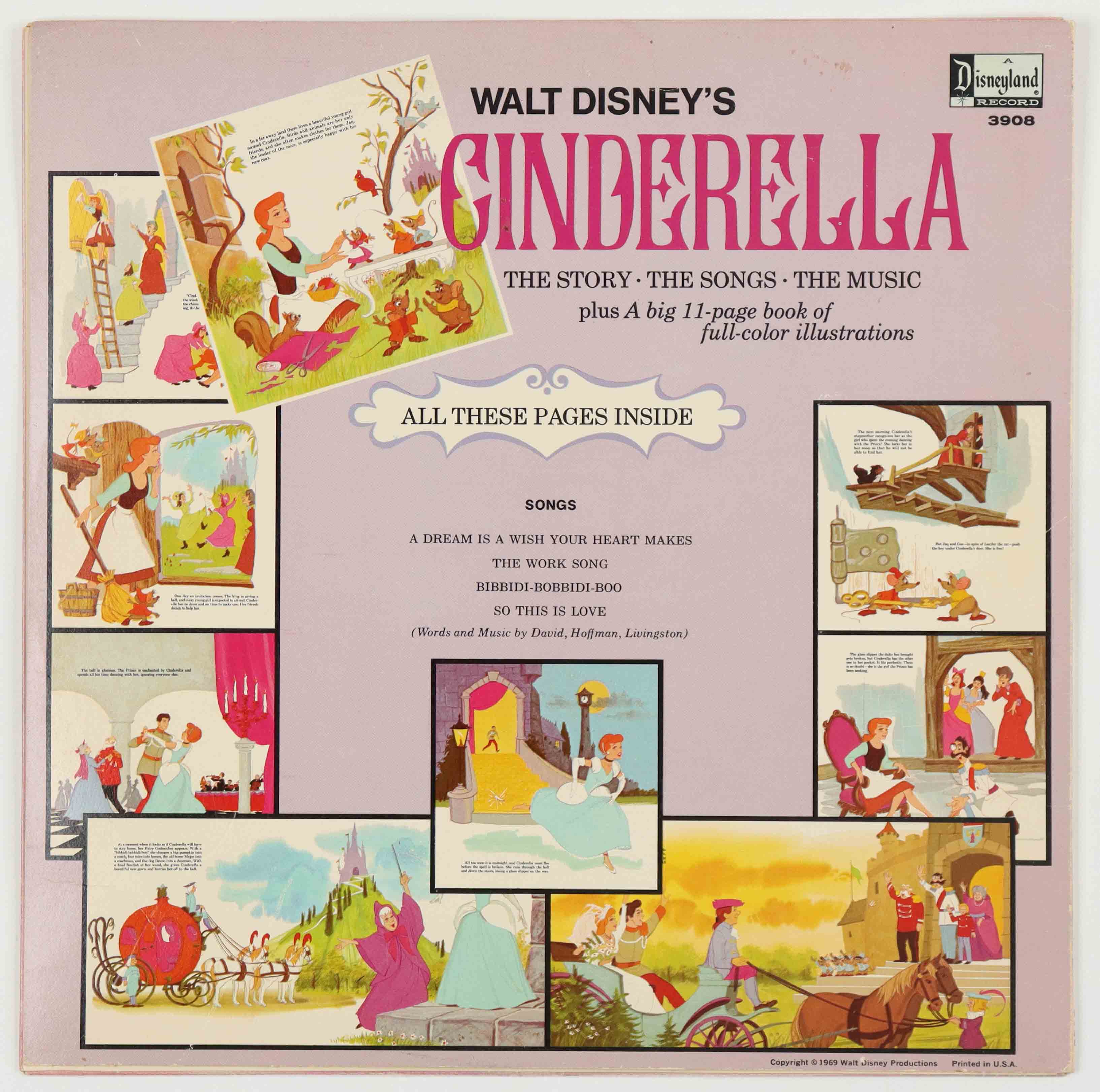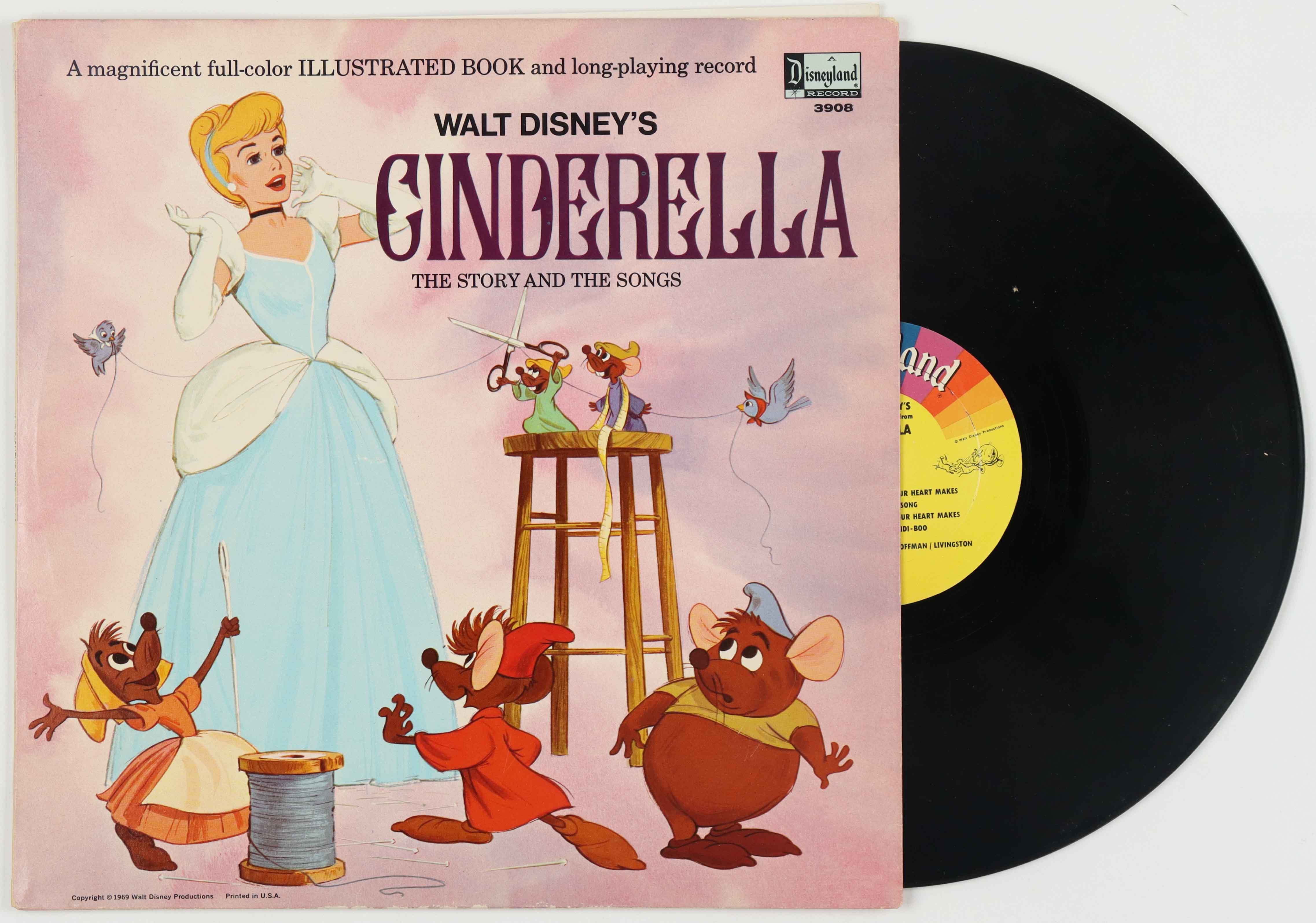 Vintage 1696 Walt Disney's "Cinderella" vinyl LP record album. The vinyl record is included with this auction. Please note that original album cover shows signs of natural aging with some creasing and scuffing on the album cover.