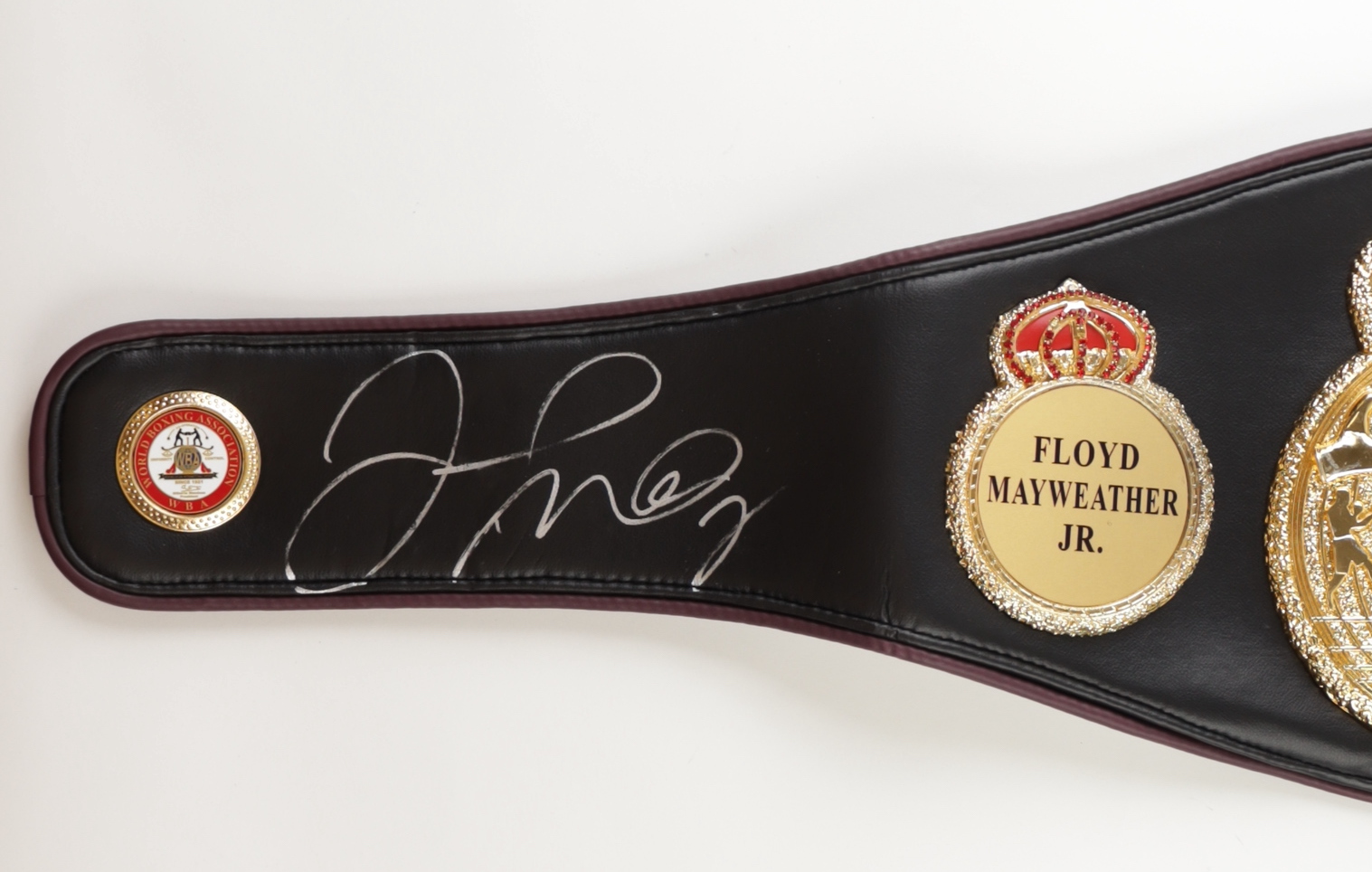 World Boxing Championship replica belt. Measures approximately 50" in length. Hand-signed by Floyd Mayweather Jr. (HOF).