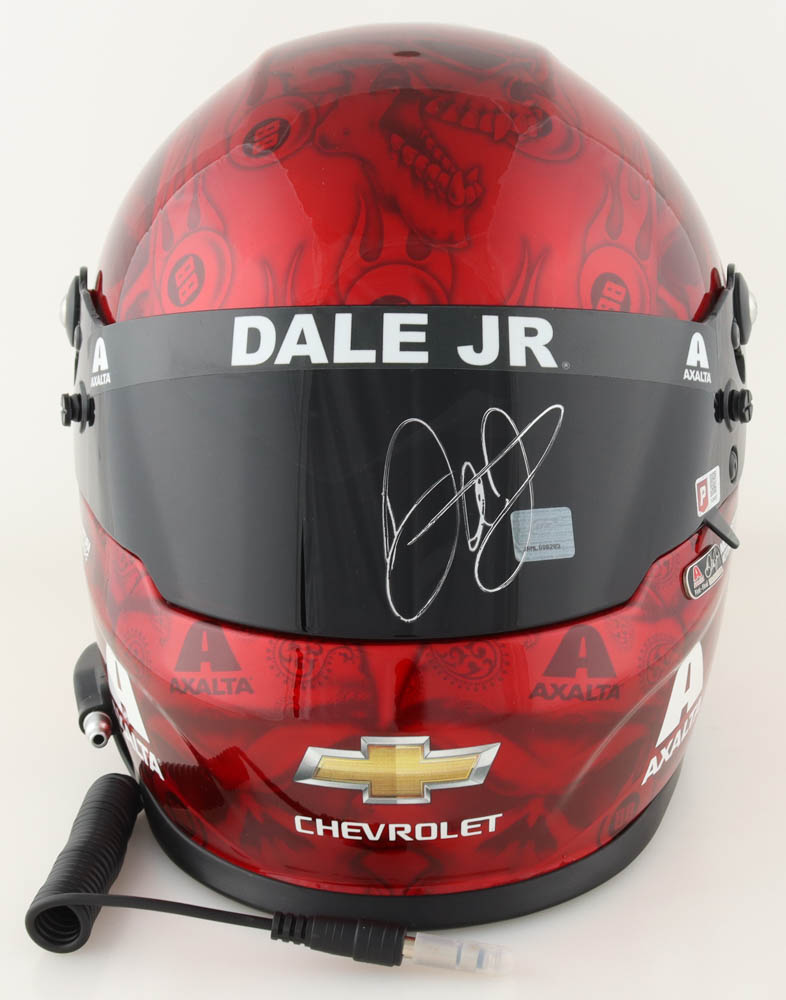Full-size special edition replica NASCAR helmet is hand-signed on the visor by Dale Earnhardt Jr. (HOF). Also includes a limited edition plaque and is limited edition to just 3,088 produced!
