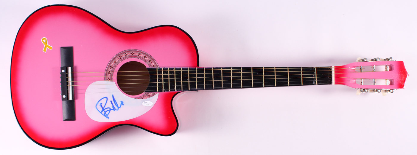 Custom pink breast cancer awareness full-size acoustic guitar. Hand-signed in blue felt-tip pen by Billie Joe Armstrong (lead vocalist, primary songwriter, and guitarist of the punk rock band Green Day).