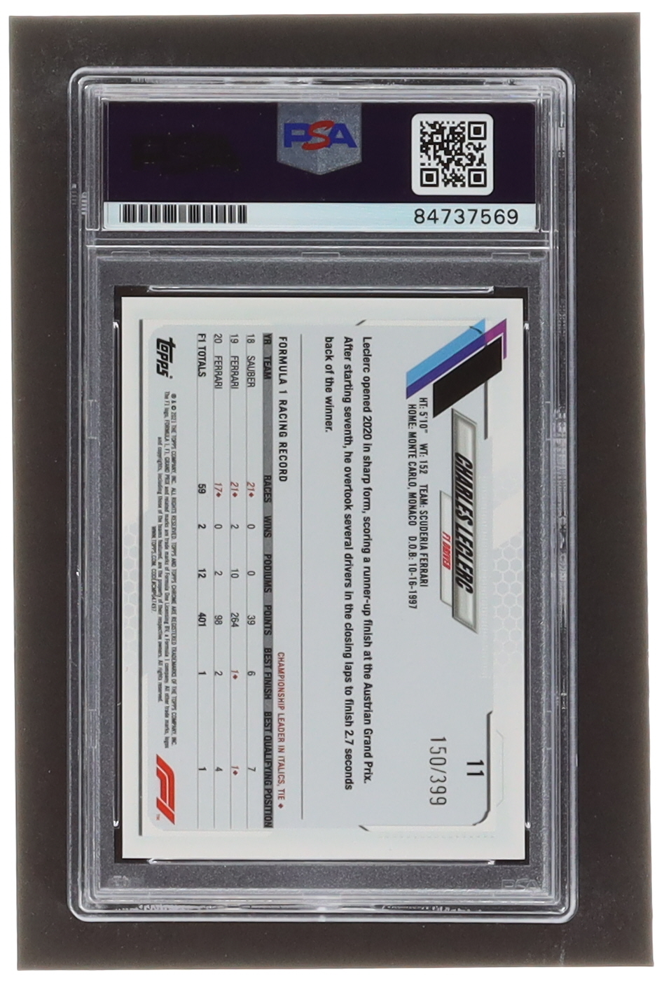 Charles Leclerc Signed 2021 Topps Chrome Formula 1 Purple Refractors #11 #150/399 (PSA)