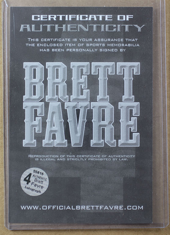 The jersey includes a Brett Favre hologram and matching COA for authenticity purposes. Also includes a proof picture from the signing.