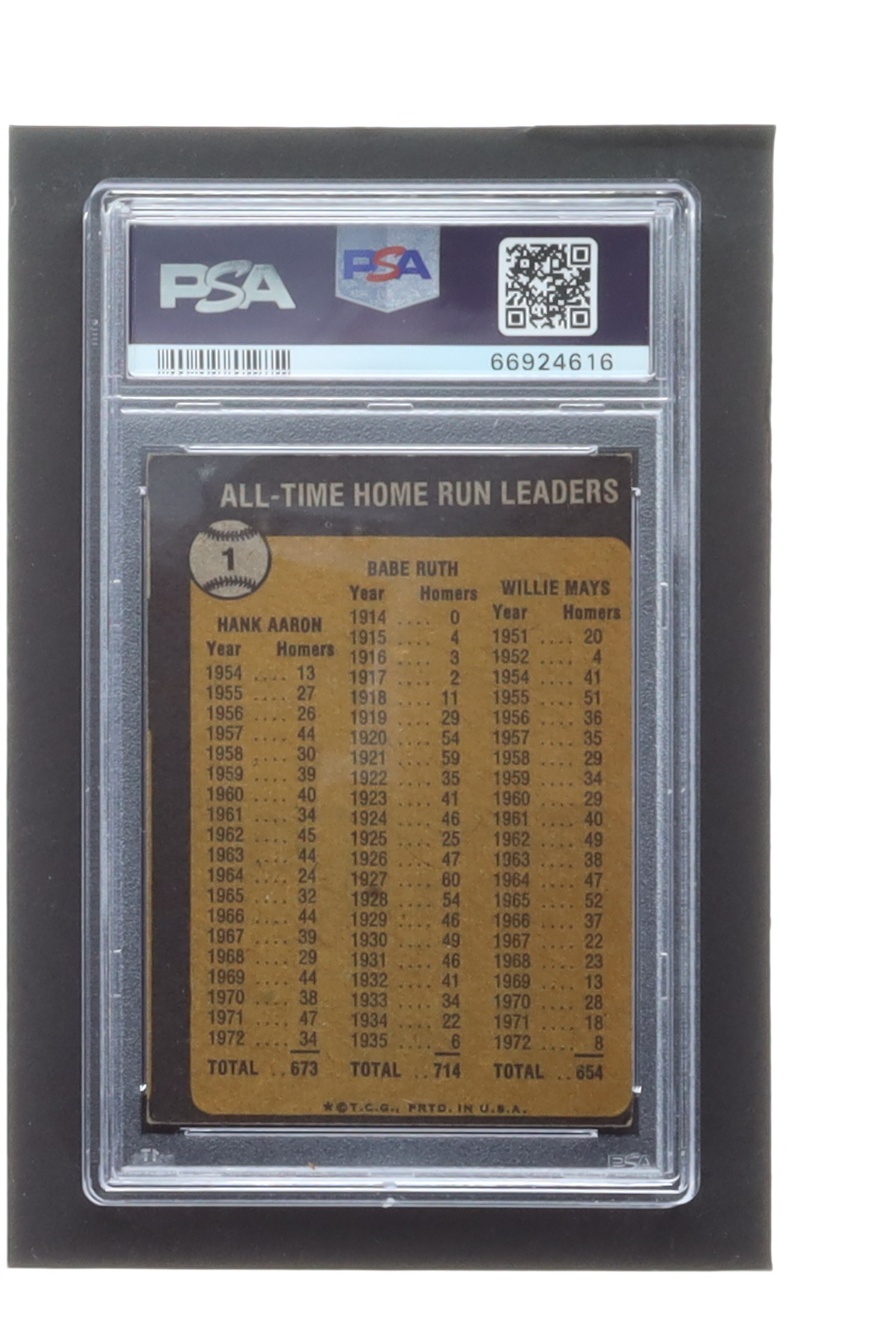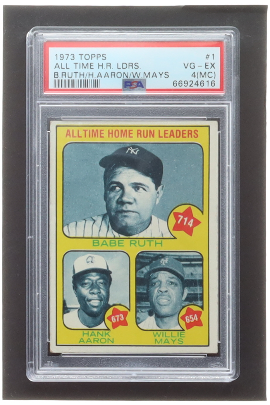 Babe Ruth 714 / Hank Aaron 673 / Willie Mays 654 1973 Topps #1 All-Time Home Run Leaders (PSA 4) (MC)