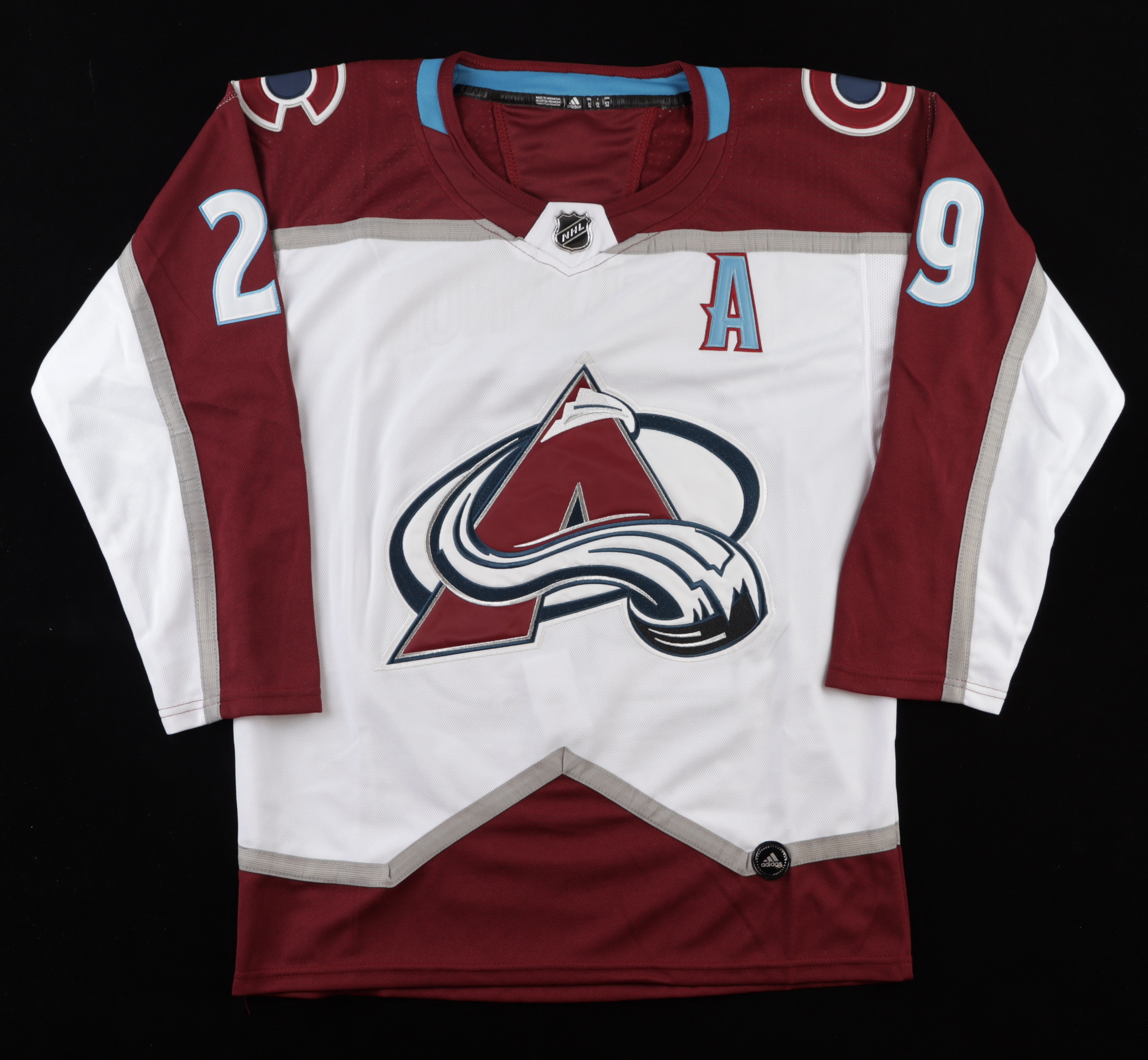 On-ice style jersey. Everything sewn on, size 54. Hand-signed by Nathan MacKinnon. Please note, the hologram is partially torn but the serial number is in tact.