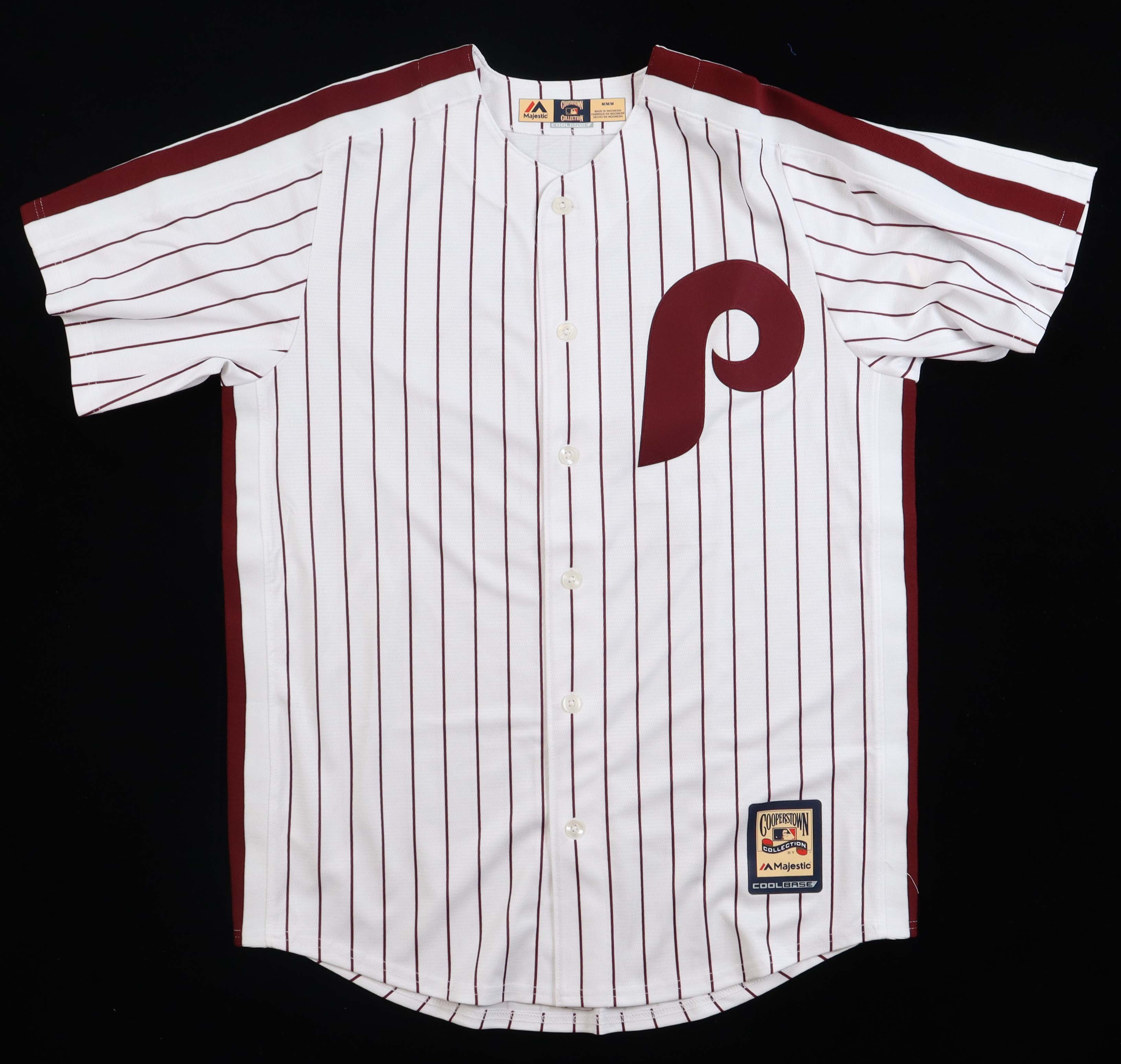 Majestic Cooperstown Collection on-field style jersey. Everything is sewn on, size M. Hand-signed by Mike Schmidt (Philadelphia Phillies, HOF).